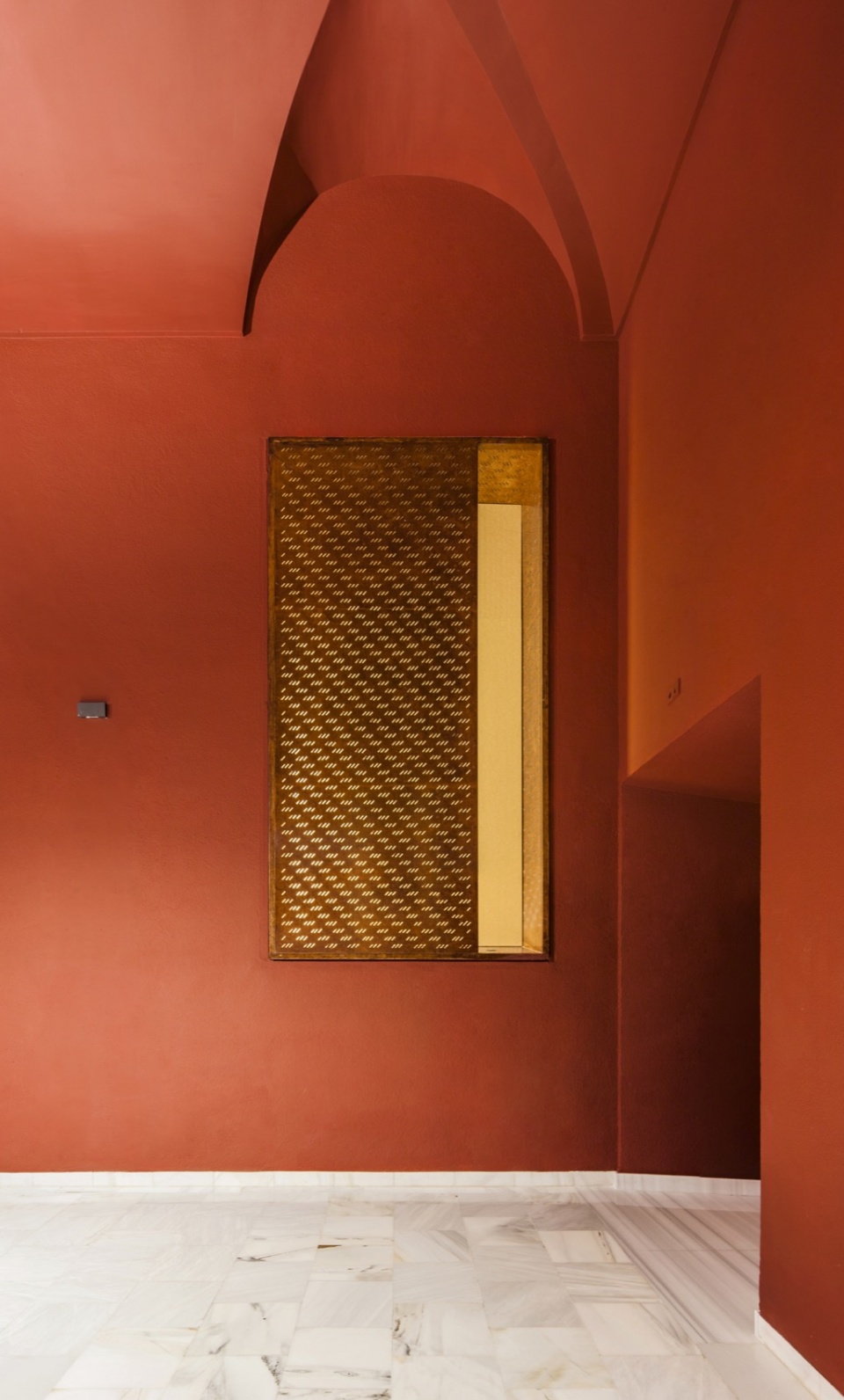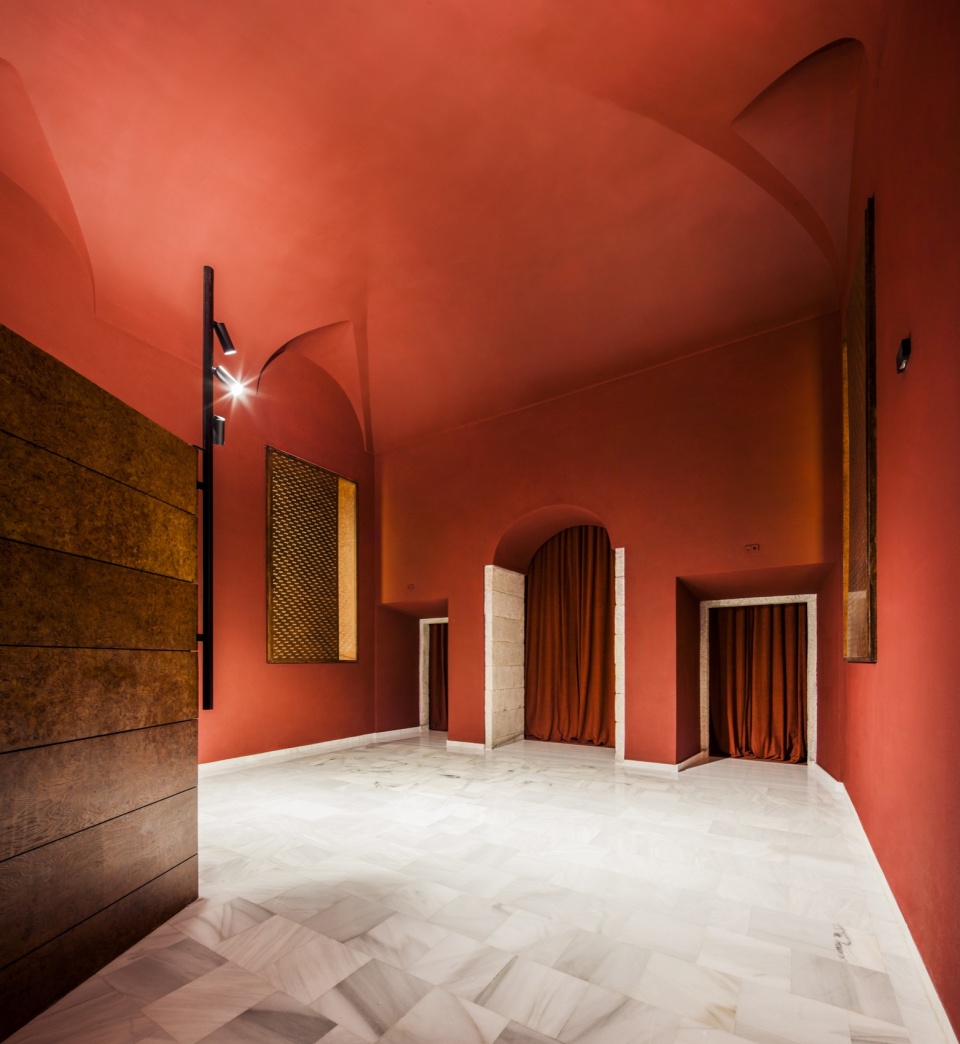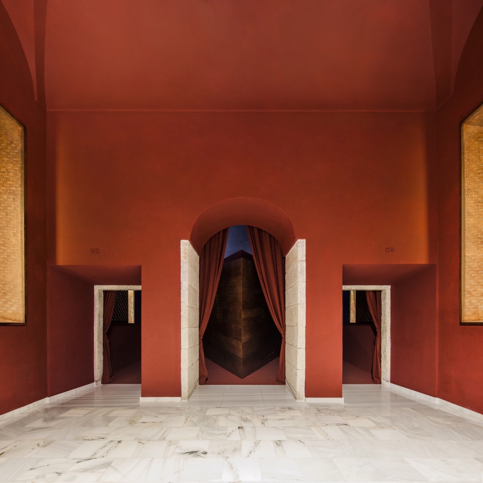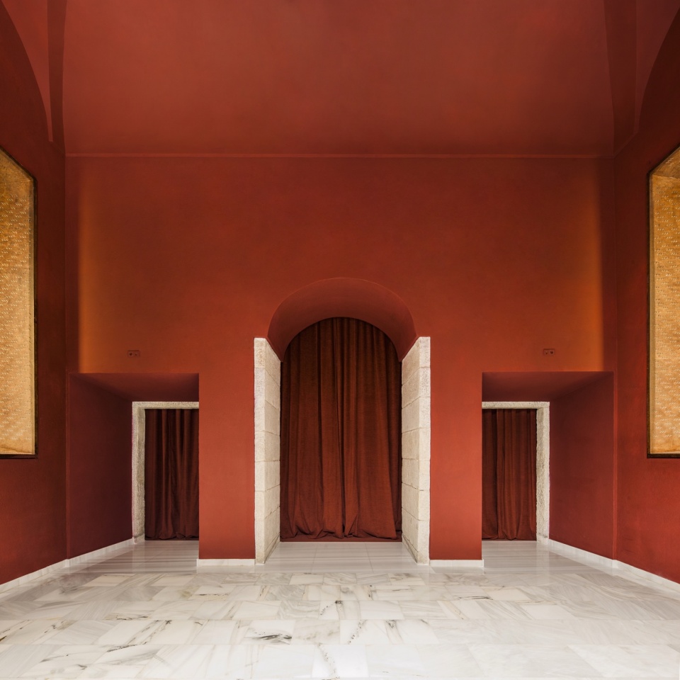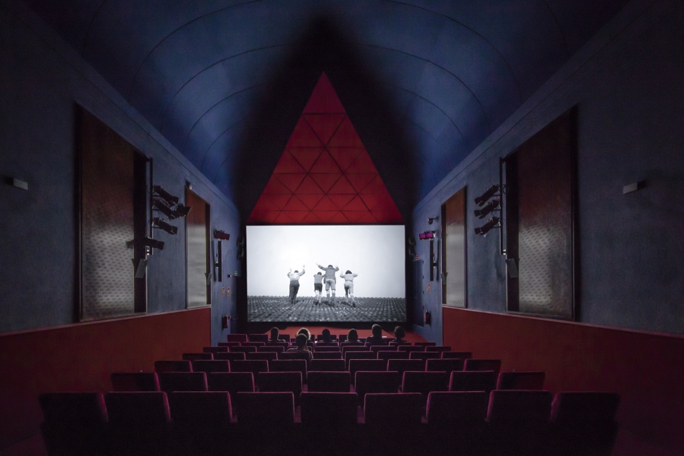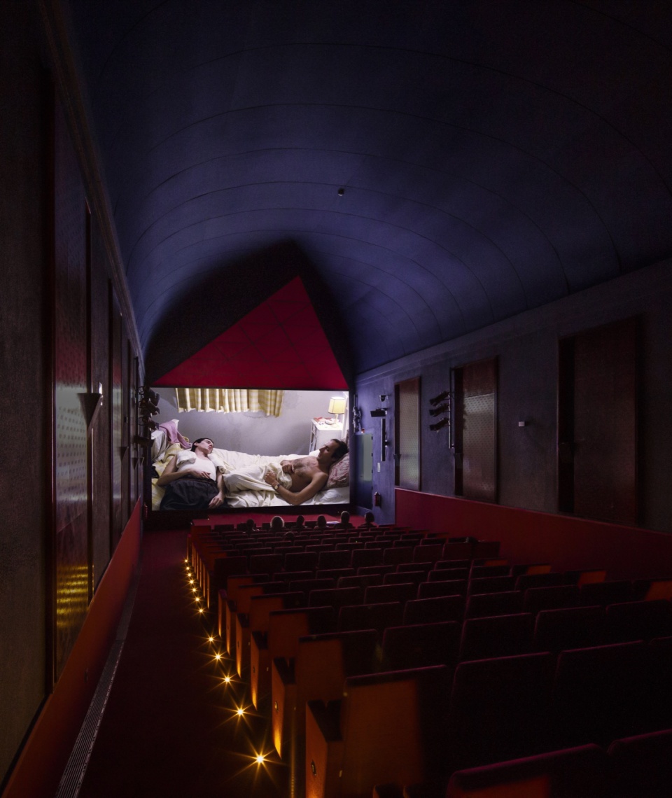 在入口门厅中,新增了一项元素:一个三角形储物装置,其几何形态与放映室相呼应,有助于引导人流向大厅深处。原有的塞利利亚(Serliana)拱廊被保留,所有表面统一为单一的红色调。该空间作为一个独特的视觉元素迎接访客,在厚重的天鹅绒帘幕后揭示新的影厅,并唤起广阔的电影宇宙——从路易斯·布努埃尔到大卫·林奇,从佩德罗·阿莫多瓦到阿基·考里斯马基。