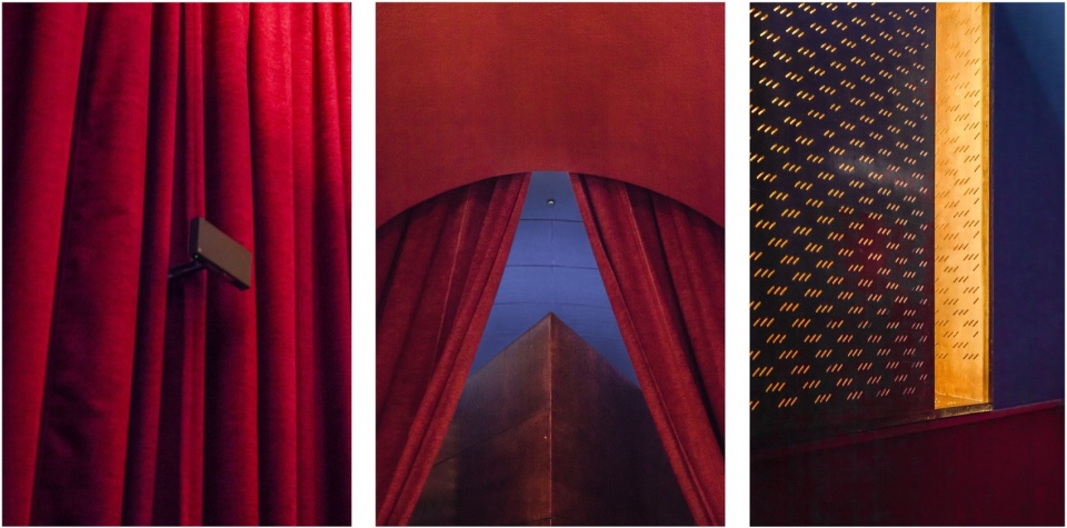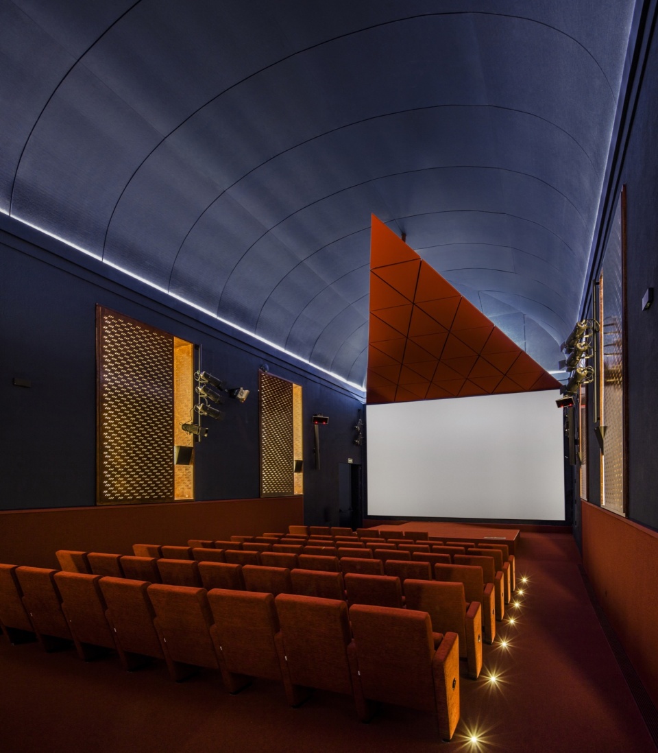 天空的蓝色与地毯的红色唤起经典剧院的意象,在空间功能(需要使用深色以避免反射)与电影及戏剧传统之间建立联系,尤其是在这样一座新古典主义建筑之中。为在这两种色调之间形成过渡,设置于窗洞凹位中的吸音表面被转化为柔和的光源,强调这些开口,使其呈现出类似室外空间的体量,从而增强“身处户外”的感受。