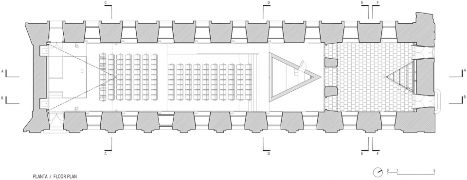 With this strategy, the aim is to adapt the hall’s conditions to its new use while maintaining the character of “geometric objects” arranged under a large, vaulted space, as envisioned in the original project: a starry sky under which different events were organized.