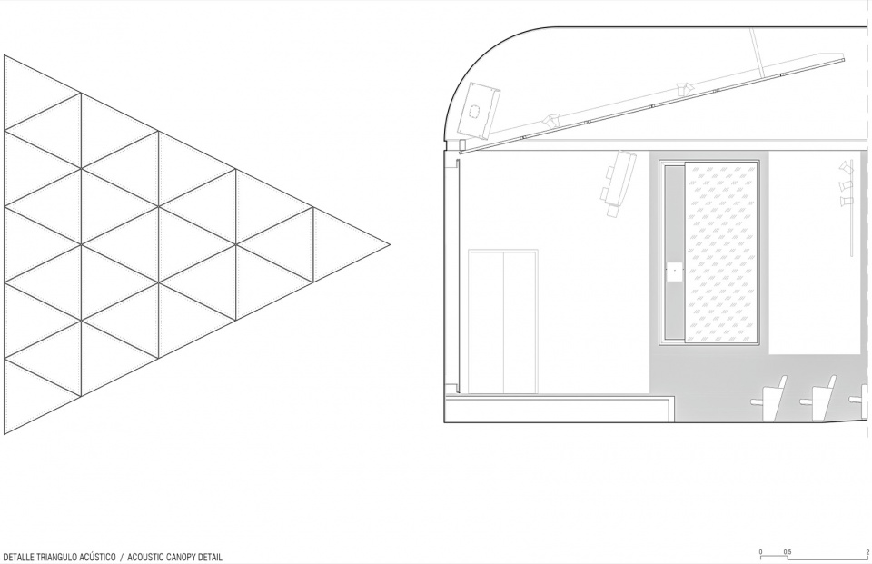 该方案旨在保留Bach与Mora项目中的标志性元素:入口处组织并划分流线的三角形放映室,以及悬置于舞台上方、原本作为混响装置的三角体。与之形成对比的是,现有的翻译间被拆除,因为当代技术已不再需要专门空间;座椅区域被调整以增加坡度并改善观影视线;而标志性的悬挂三角体则被转化为一个大型声学屏幕,用于遮蔽中央扬声器。