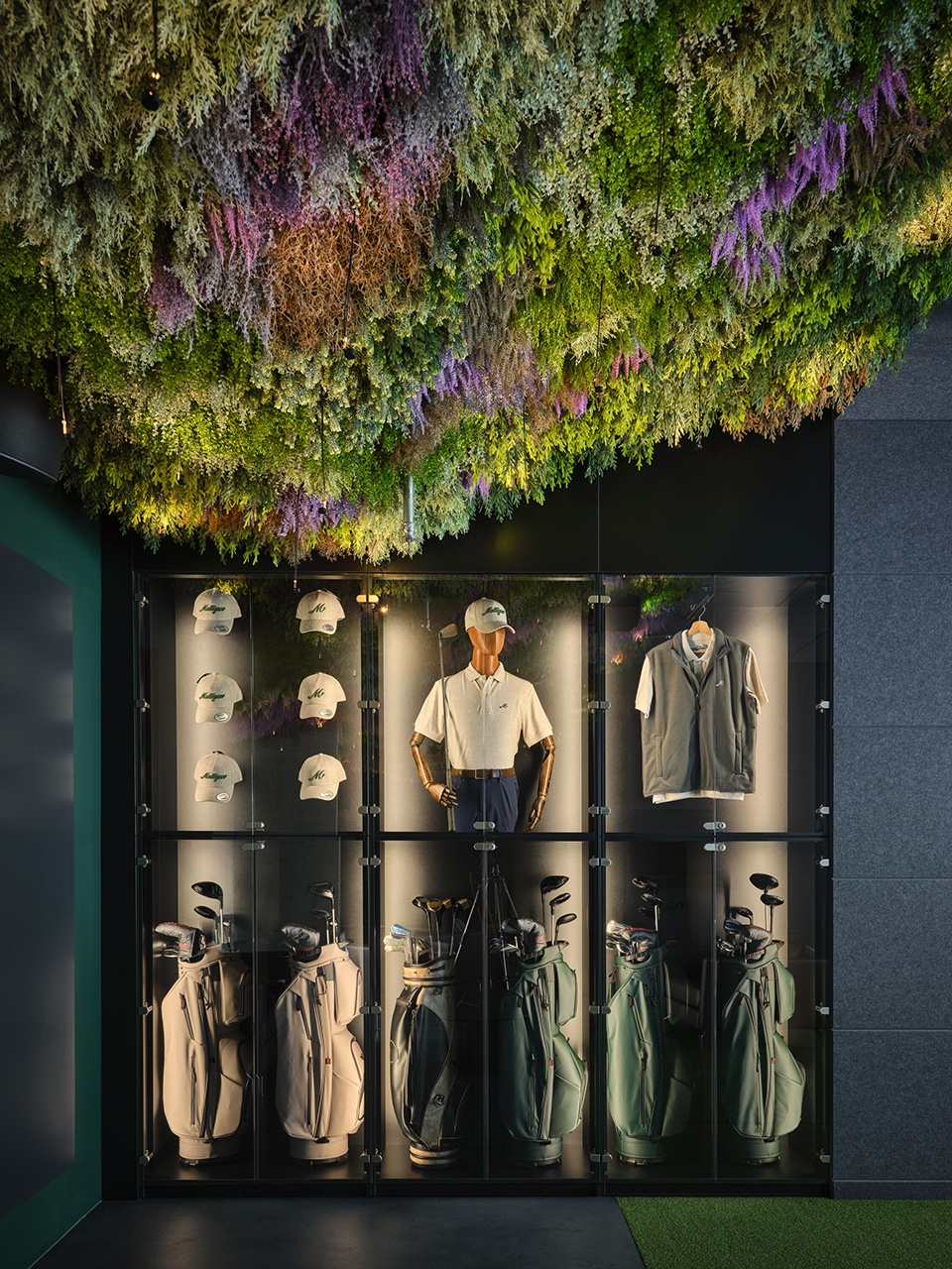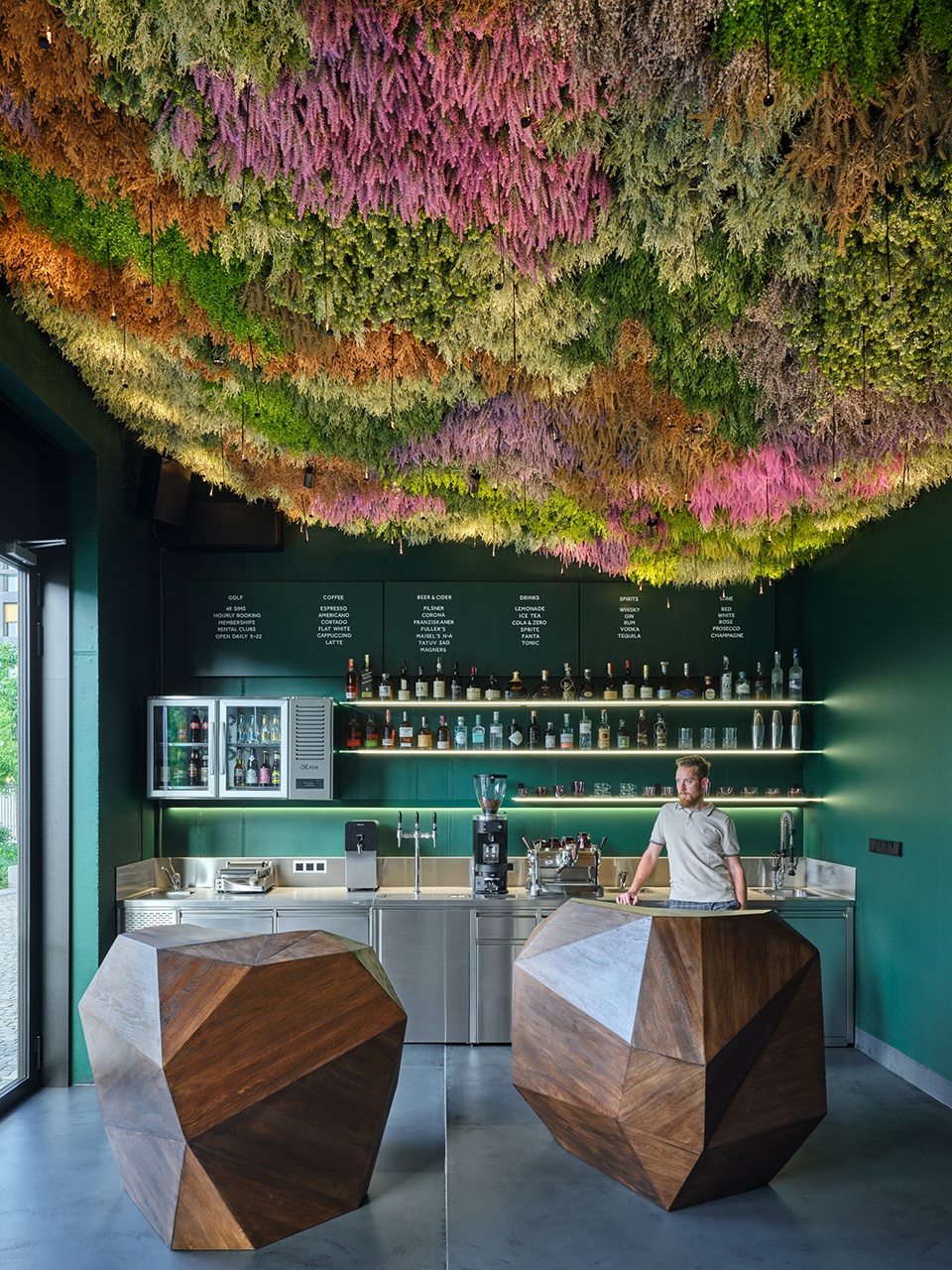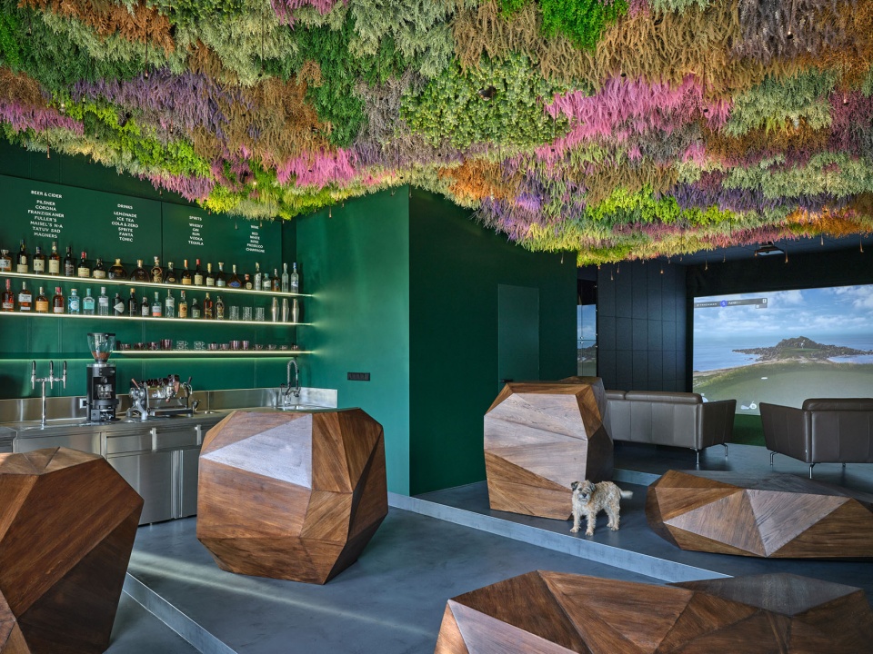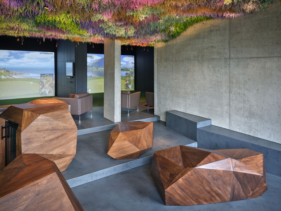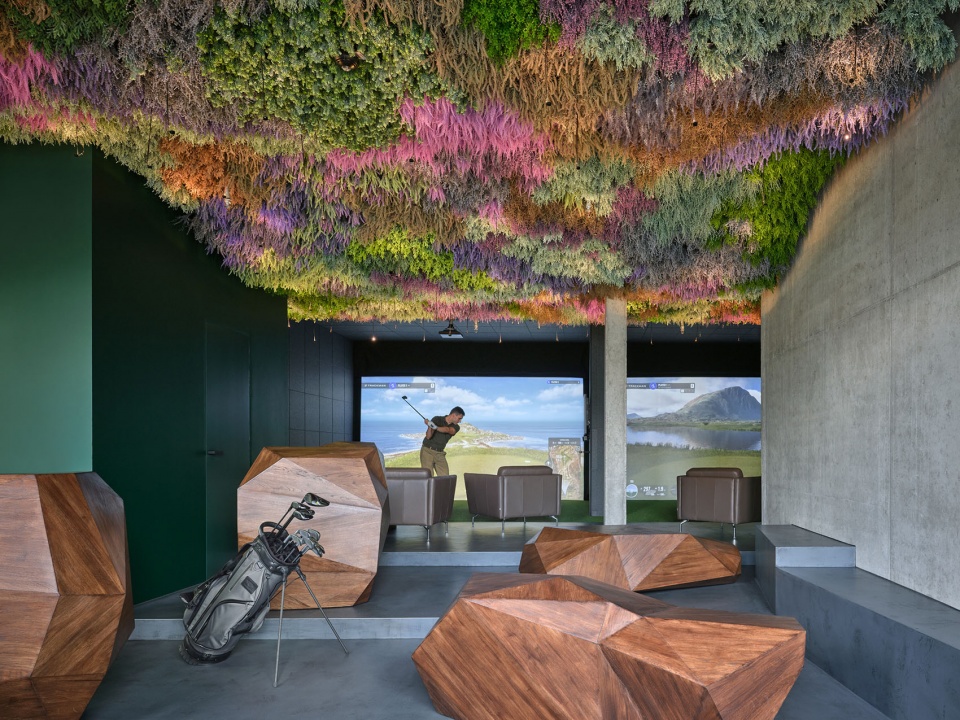 The architectural concept draws inspiration from the Scottish Highlands, the cradle of golf. The architects’ goal was not to create a thematic decoration but to materialize a landscape – to translate its form, structure, and mood into an interior. The ceiling installation, reminiscent of a heather field, transforms the space into an abstract piece of nature. It ripples above the players’ heads like a living relief, creating a dynamic play of colour, light, and shadow. Below it unfolds a composition of tiered flooring with five freely placed “stones” – handcrafted wooden artifacts that connect the landscape motif with the world of design. Concrete, wood, and deep shades of green form the material palette that emphasizes the raw poetry of the design. The composition is restrained, allowing the architecture to serve as a backdrop for movement, light, play, and social interaction.