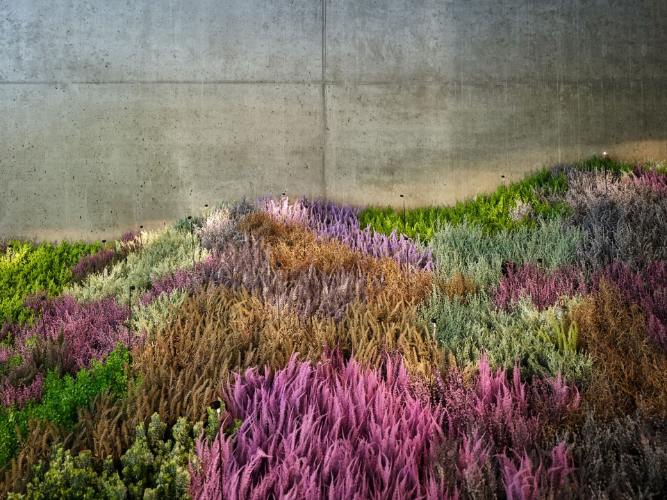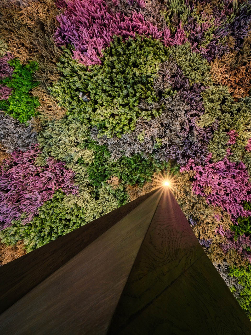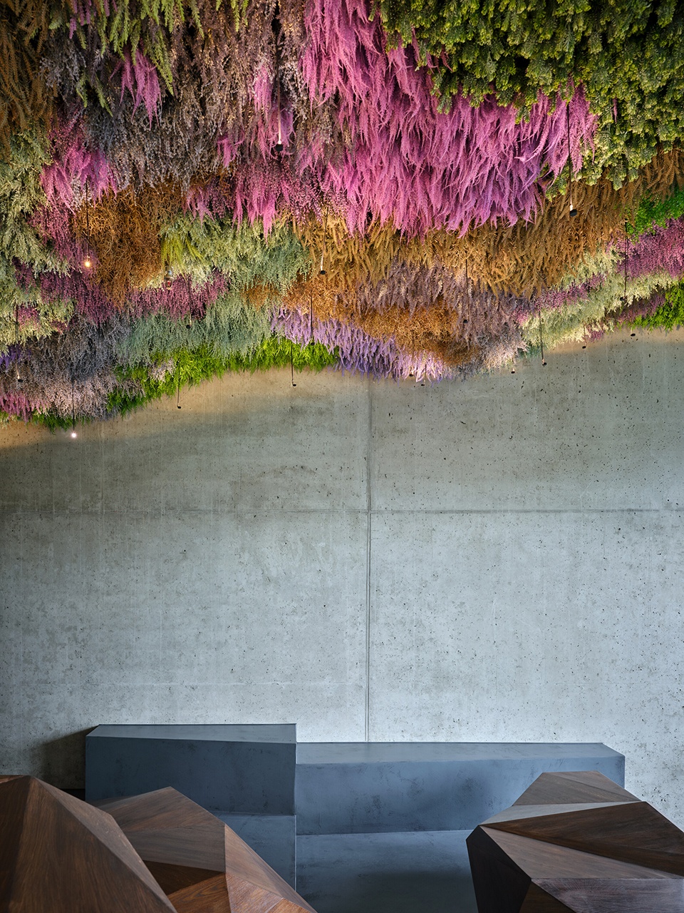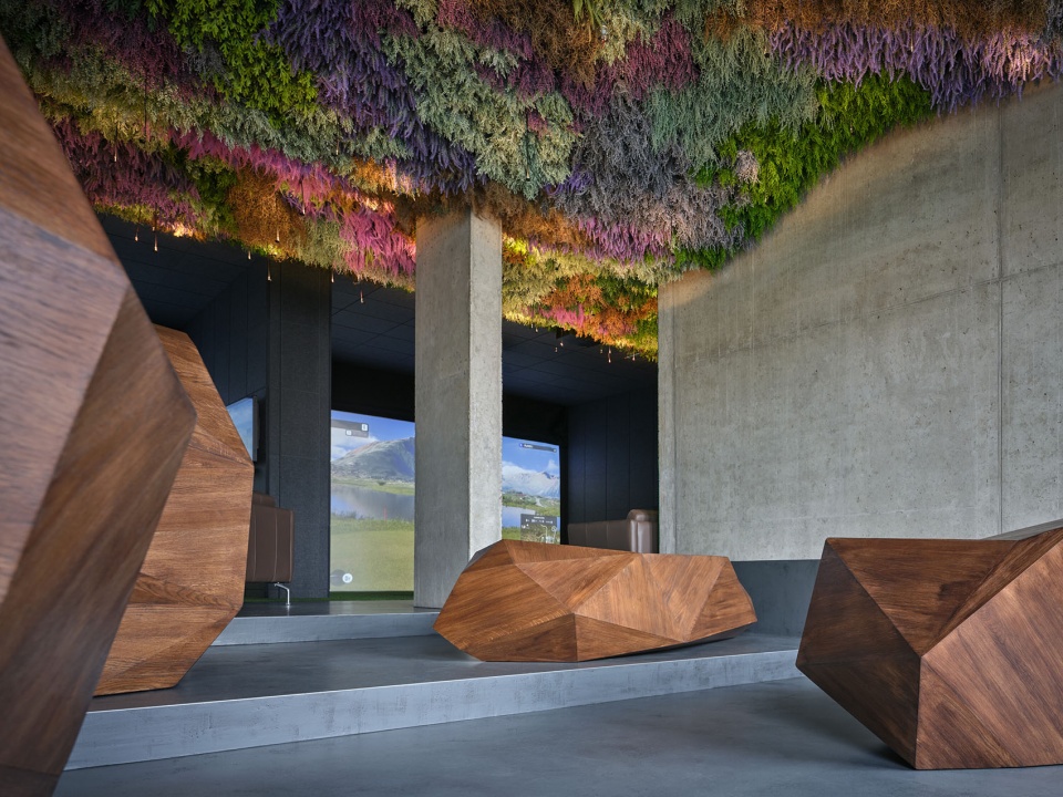 建筑概念灵感源自高尔夫运动的发源地——苏格兰高地。建筑师的目标并非营造一种主题化的装饰,而是对景观进行物质化表达——将其形态、结构与氛围转译至室内空间之中。天花装置仿佛石南花田,将空间转化为一片抽象的自然景观。它如同具有生命的浮雕般在使用者头顶起伏,营造出色彩、光影的动态变化。其下展开的是一组分层的地面构成,点缀着五块自由摆放的“石头”——手工制作的木质装置,将景观意象与设计语境相连接。混凝土、木材与深绿色调构成了材料体系,强化了设计中质朴而富有诗意的表达。整体构成克制内敛,使建筑成为承载运动、光线、游戏与社交互动的背景。