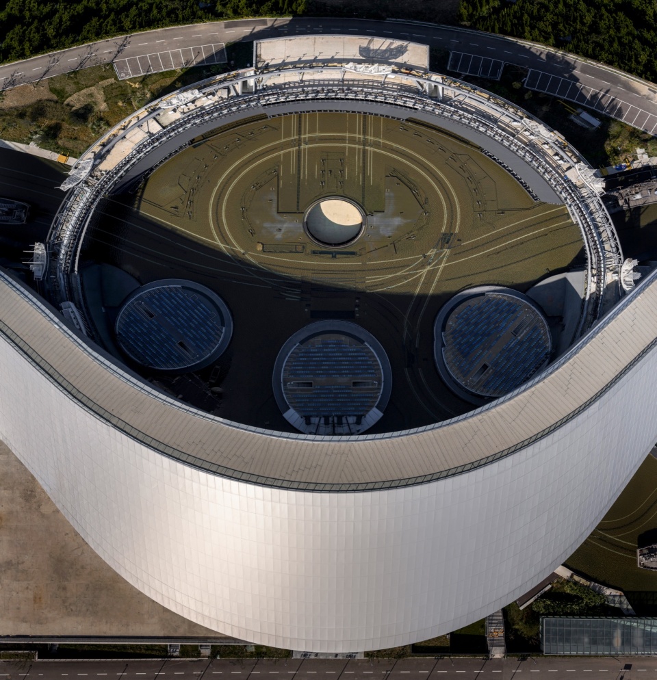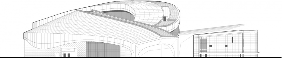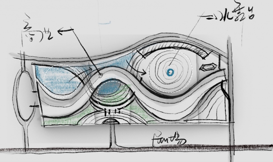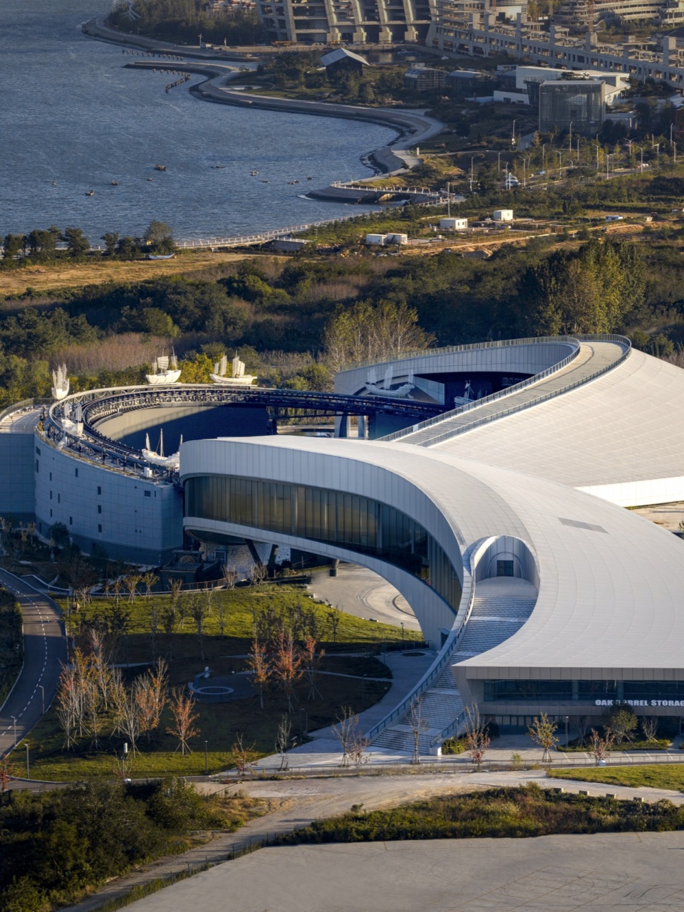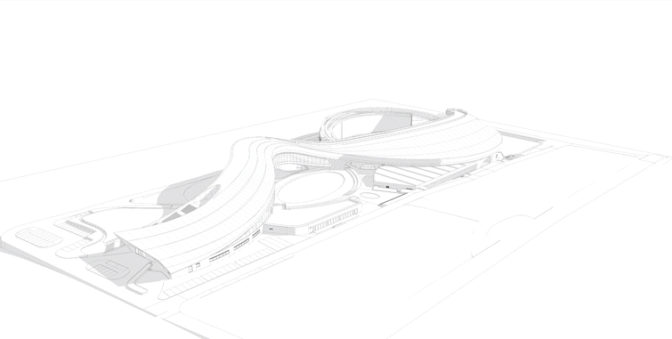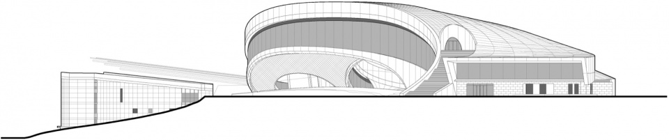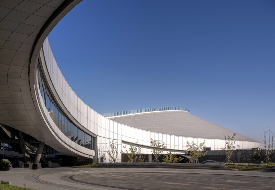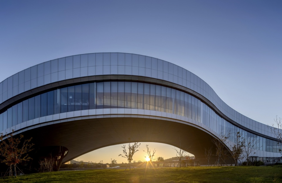 Drawing on maritime elements, the design adopts three circles and free-flowing curves as its plan layout. The building’s roof rises gradually from the ground, its undulating form seamlessly integrating with the terrain. The site features significant elevation changes, sloping downward from south to north and east to west, which perfectly accommodate the wave‑like building.