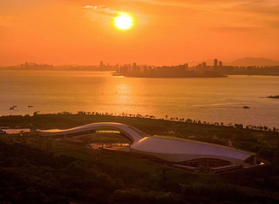 The project is located on the eastern side of Gujia Island in Tangdao Bay, Qingdao West Coast New Area. The peninsula, surrounded by the sea on three sides, spans 79 mu with a total floor area of 37,100 square meters. Backed by mountains and facing the sea, it echoes the city in the distance.