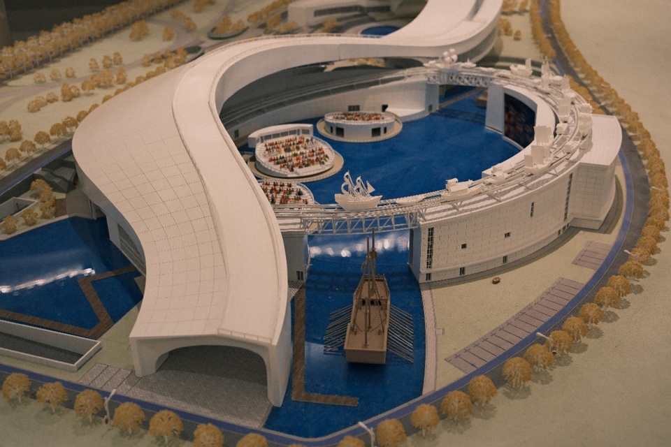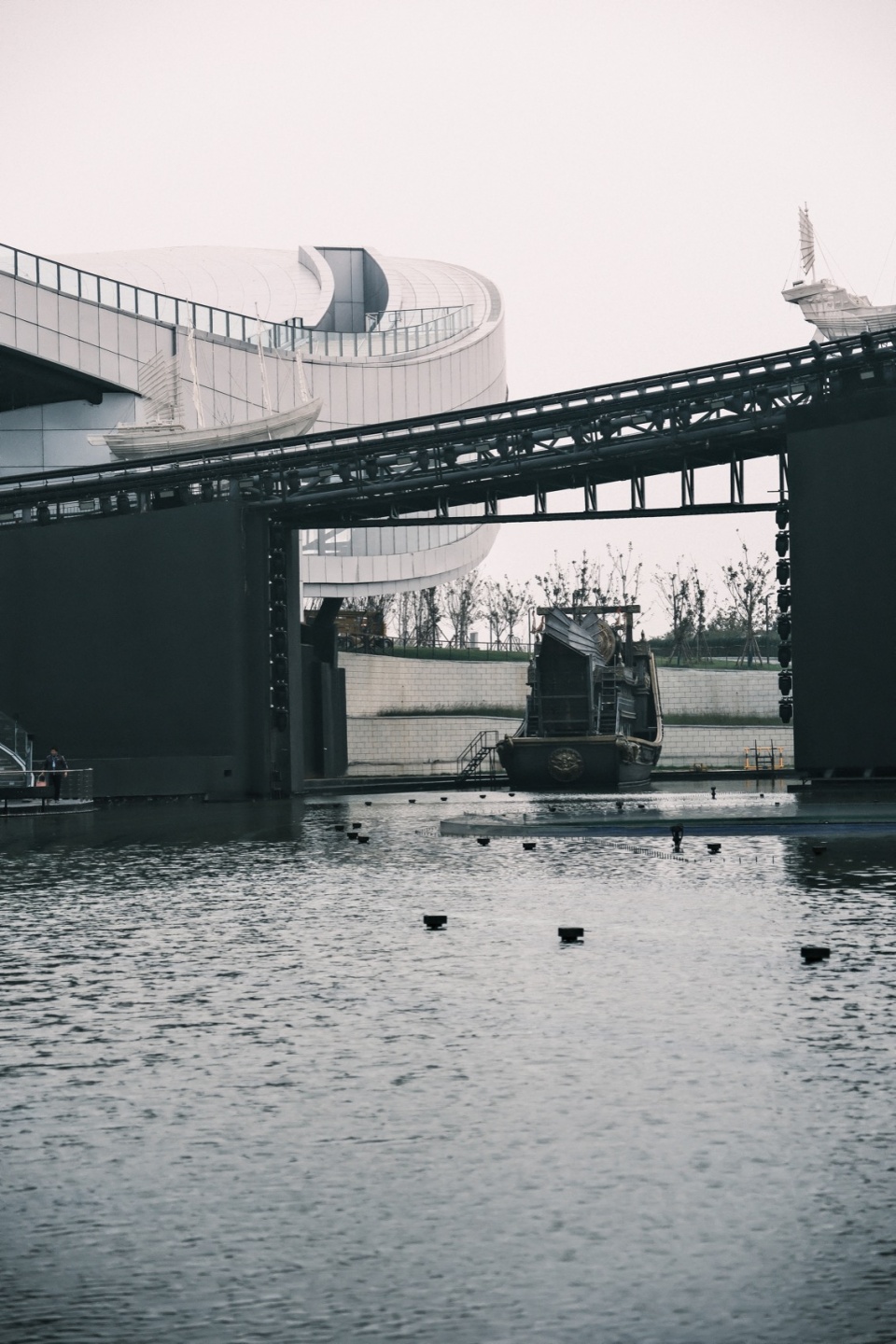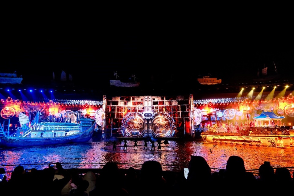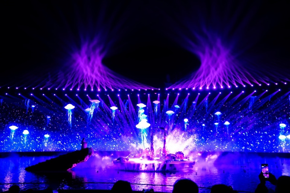 设计首创直径120米的人造水台,全覆盖水循环系统精准模拟了真实海浪涌动,在陆地上打造出一片海。水中央设有三个圆形观众席,分别可容纳500名观众,观众席可360°旋转。超巨幕环状机械舞台环抱水台,上方有布景船进行动态表演。通过“船在天上,海在地上”的创新空间。以及环抱式影效与真实数实融合的视觉技术,打造沉浸式观演体验。