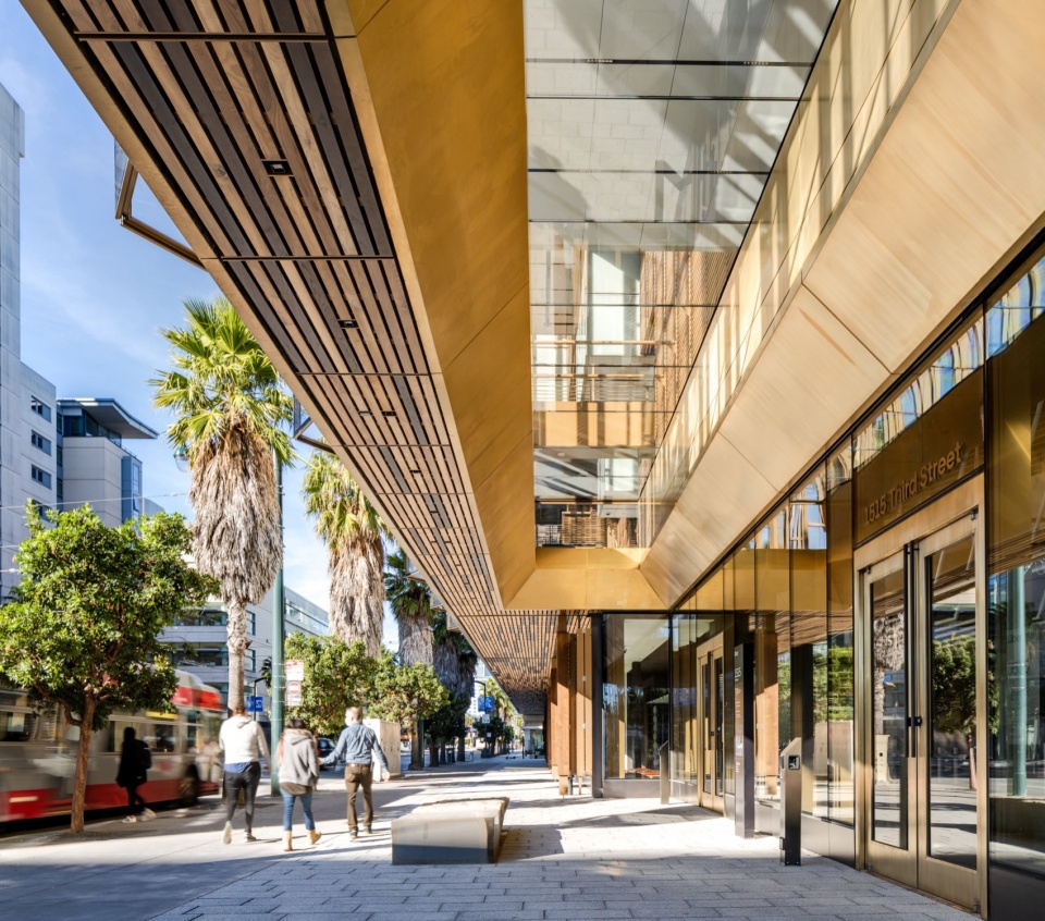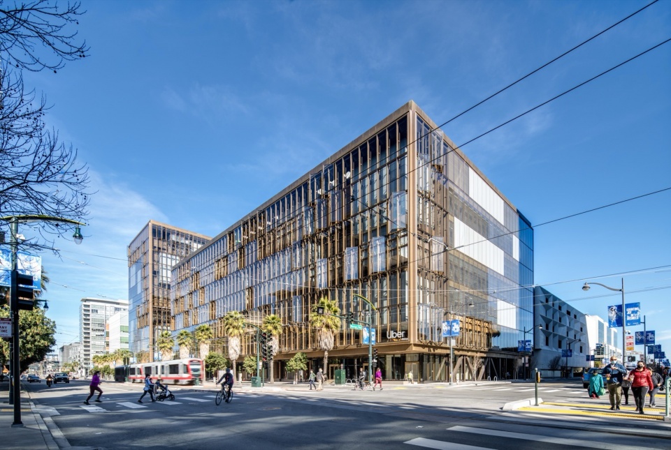 ▼Uber 总部位于 Mission Bay 街区转角,以分解后的体量与开放的街道界面重新进入城市,The Uber headquarters sits at a corner in Mission Bay, re-engaging the city through fragmented massing and an open street interface