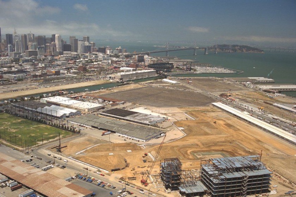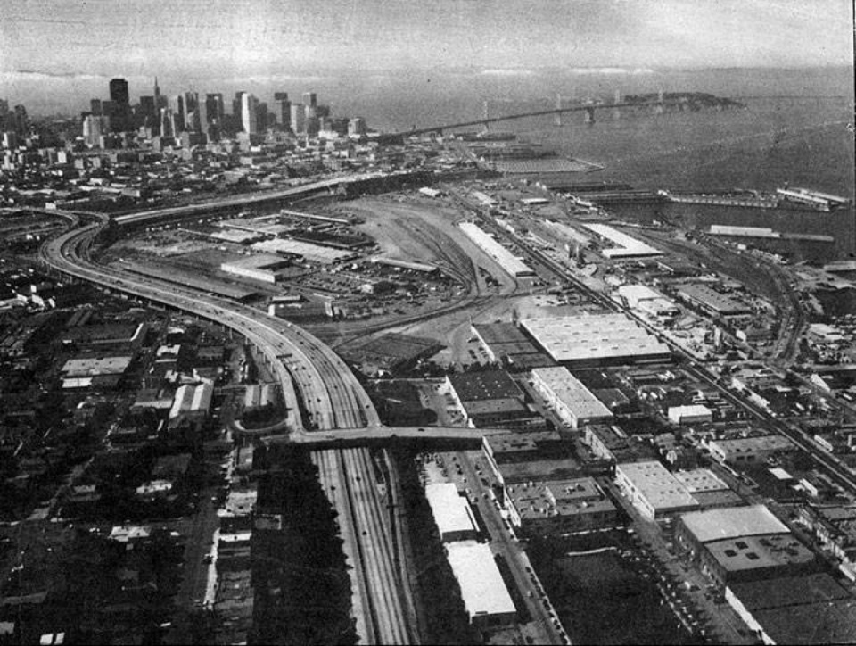 ▼20 世纪 80 年代初的 Mission Bay,仍以铁路用地、仓储设施和工业场地为主,Mission Bay in the early 1980s, dominated by rail yards, warehouses, and industrial sites