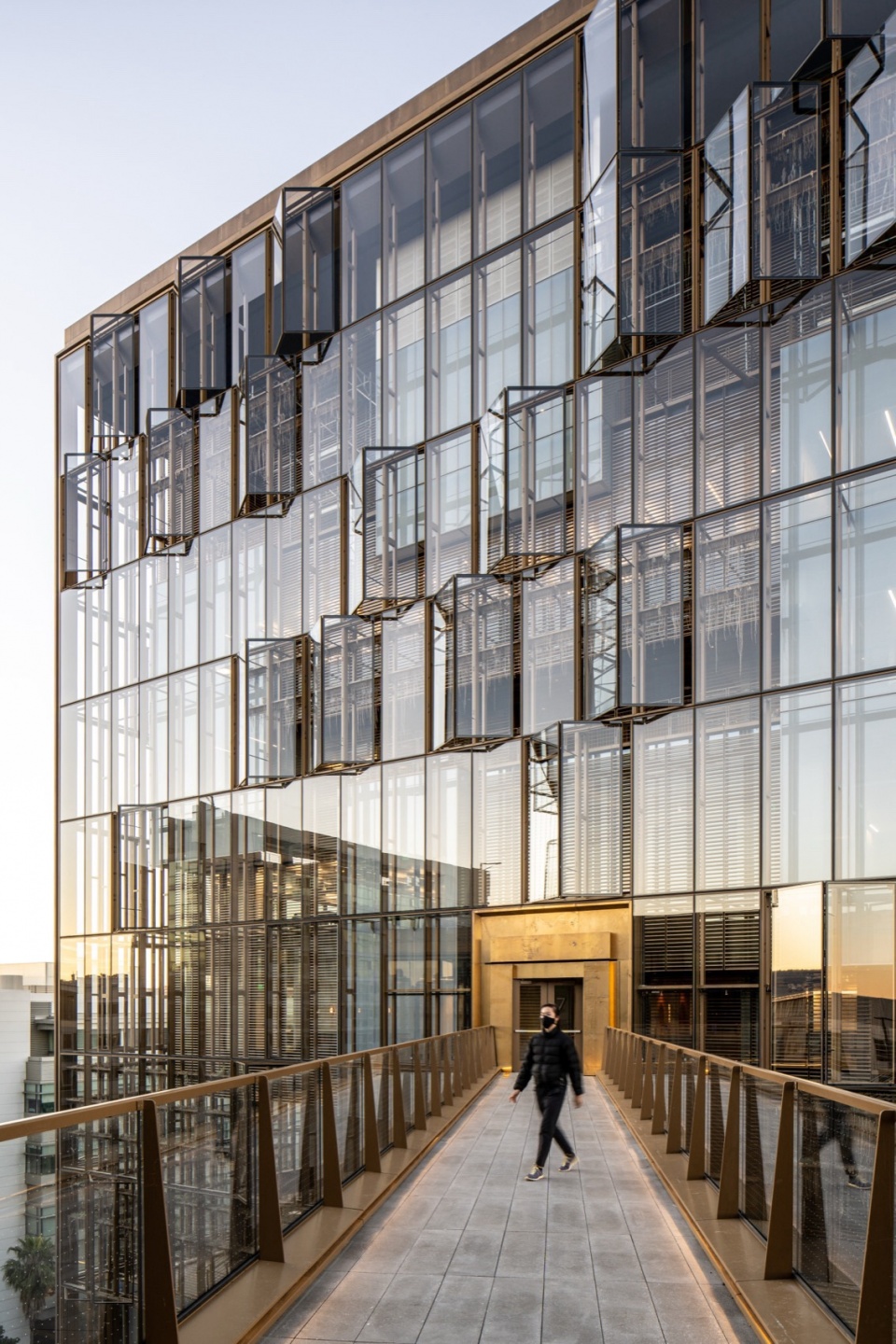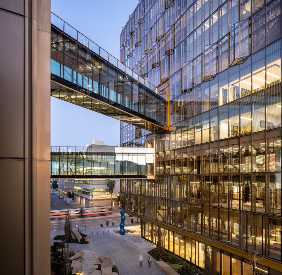从街角逐步靠近 Uber 总部时,很难把它理解为一座单一的大体量建筑。项目由两栋建筑组成,一栋 11 层,另一栋 6 层,它们通过透明连桥在不同标高之间连接起来。对我们来说,这种处理并不是为了把总部做得更“复杂”,而是为了避免它继续沿用典型科技园区那种完整、封闭的大块体量逻辑。两栋体量之间的空间也不是简单的留缝,而更像一段被主动组织出来的街巷式步行空间。它让总部不再是一个完整对象,而更像是街区关系的一部分。也正因为如此,这个项目最早的建筑判断,并不是“总部应该有多强烈的存在感”,而是“它如何在进入城市之后,仍然保持从人的尺度来展示可读性”。