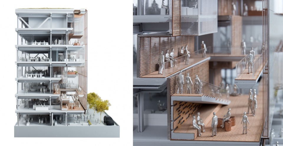 ▼剖面模型显示了“共享中庭”与办公区之间的关系:可开启立面、平台系统与固定围护共同构成一层介于室内与室外之间的过渡环境,Section model showing the relationship between the Commons and the office areas: operable façades, platforms, and fixed enclosures together form a transitional environment between inside and outside