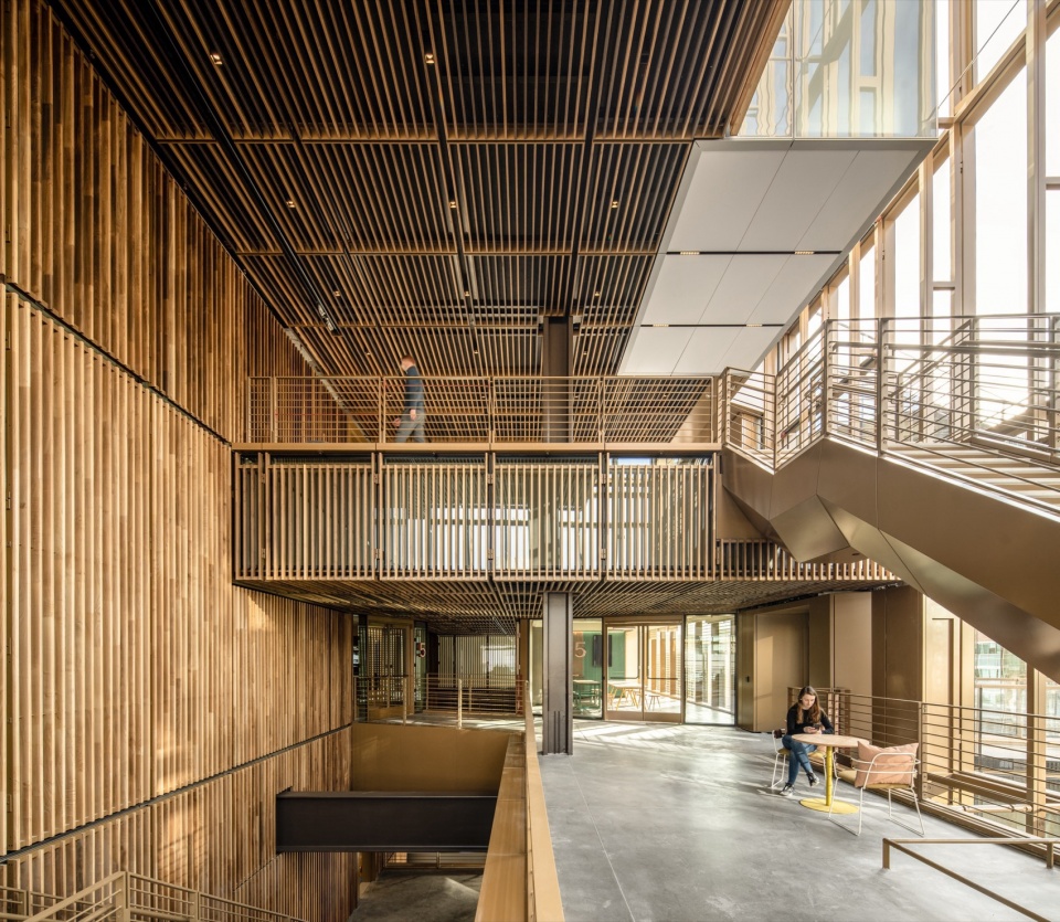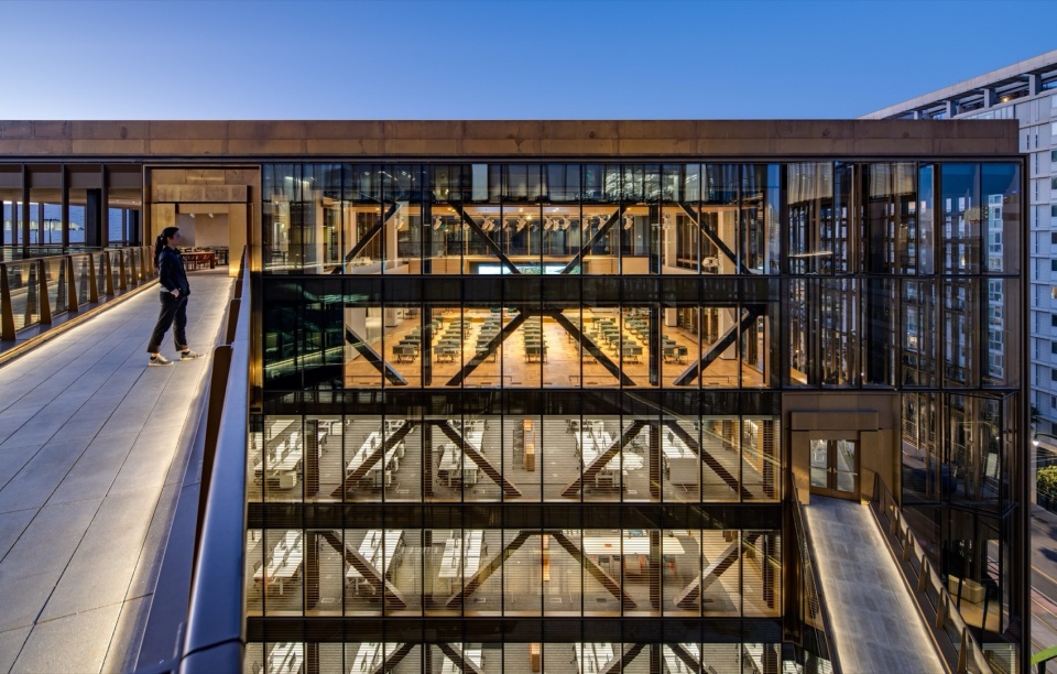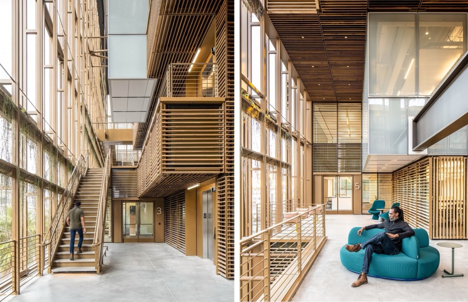 在融入街区的情况下,我们也考虑了如何兼顾企业办公的安静与私密的需求,于是我们在企业总部内,创造了一个街区与办公的过度空间。不得不说,旧金山的气候条件给这个项目带来一个很特别的前提:一年里大约有十个月,温度和湿度都处在一个比较宜人的范围内。我们当时关心的问题,并不是把外立面做成一层更封闭的玻璃表皮,而是在建筑里创造一种会“呼吸”的空间——真正会打开使用的中间空间。也正因为如此,最后形成的并不是一套单纯追求透明度的幕墙,而是一层可以随着气候变化进行调节的界面。位于建筑“共享中庭”边缘,我们打造了可自动开启的玻璃,它会和屋顶气象系统联动,在条件合适的时候引入自然通风;而需要完全室内办公的区域,则位于其后的固定围护系统之内。这样一来,“共享中庭”更像是一层介于城市外部和空调办公环境之间的缓冲带,而不是传统意义上的全空调室内空间。