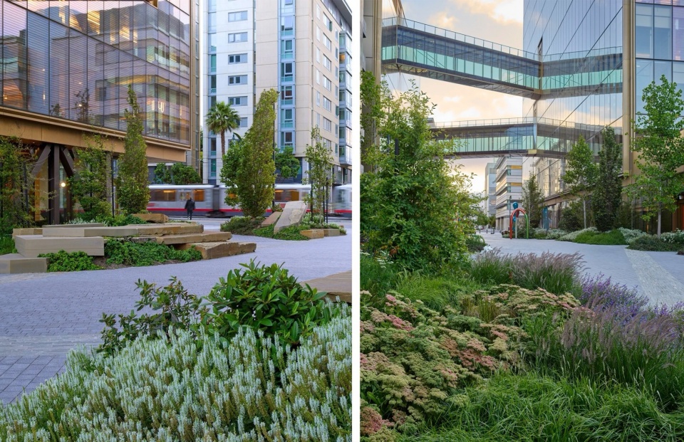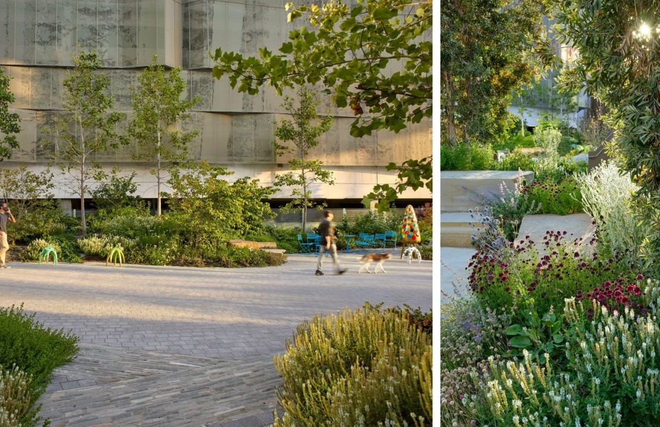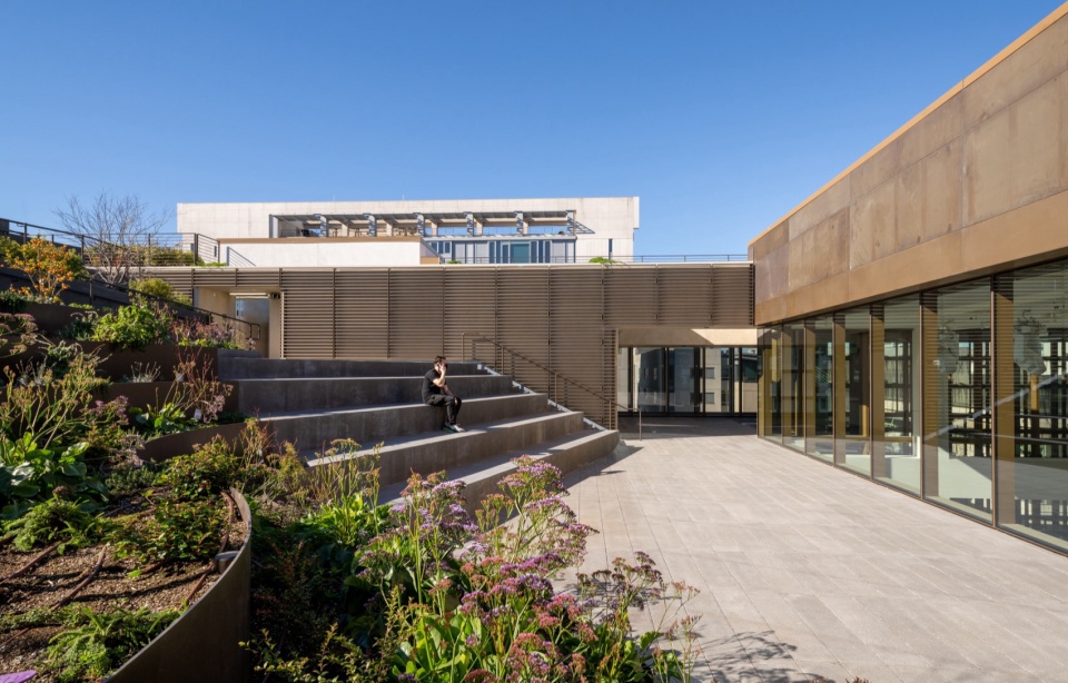 这个项目的景观设计并不只发生在地面,也不只是在建筑顶部放一个屋顶花园。这个场地的景观,是围绕一条线性公园展开的,它连接 3rd Street 与 Bridgeview Way;在这个原本更多是服务于基础设施和通行的空间,通过我们的改造,被转化成真正可以停留和使用的公共绿地。不同铺装、种植与步行动线被重新组织在一起,形成连续的开放空间体验。与此同时,屋顶上的绿植与露台并不是独立存在的“上层花园”,而是和地面的绿化、公园界面以及整个项目的生态策略一起,构成同一套景观体系。屋顶因此也不只是一个休憩层,而是整套绿化系统向建筑内部与上部空间的自然延伸。建筑顶部的露台被划分为多个可以停留的小型区域,一侧是种植区与可食用植物带,另一侧则是开敞的平台,可以用于会议、休憩,或者只是放空自己,看看街区景观。从这里向外望去,可以看到 Mission Bay 的街区逐渐展开,远处是 UCSF 的研究建筑群,再往北则是旧金山市中心的天际线。对我们来说,这种整体性比单独强调某一处“花园”更重要。它让建筑、场地和街区之间形成了更完整的联系,也让这座总部从一开始就更像城市环境的一部分,而不是一个独立摆放的企业对象。