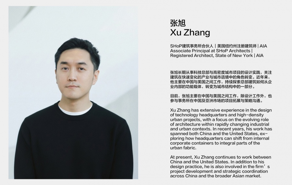 张旭现任 SHoP Architects 合伙人、美国纽约州注册建筑师(AIA),长期从事高密度城市与复杂建筑类型的设计实践。其主导或参与的项目涵盖科技公司总部、超高层住宅及城市综合体等多个领域。