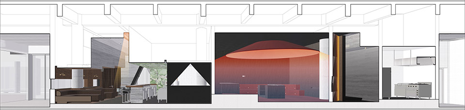 The second level is microscale, enhancing the spatial experience through visual contrast. A series of niches, only 2 meters high, are carved into a 5-meter-high boulder. While appearing slightly low when standing, they offer a unique sense of enclosure when seated. These niches can serve as booths, bars, party areas, or restrooms. Different materials are used in each niche, while the interior maintains a unified texture. The experience of wandering and exploring these differently styled mines is akin to being enveloped in the rich textures revealed by the cutting of various ores.