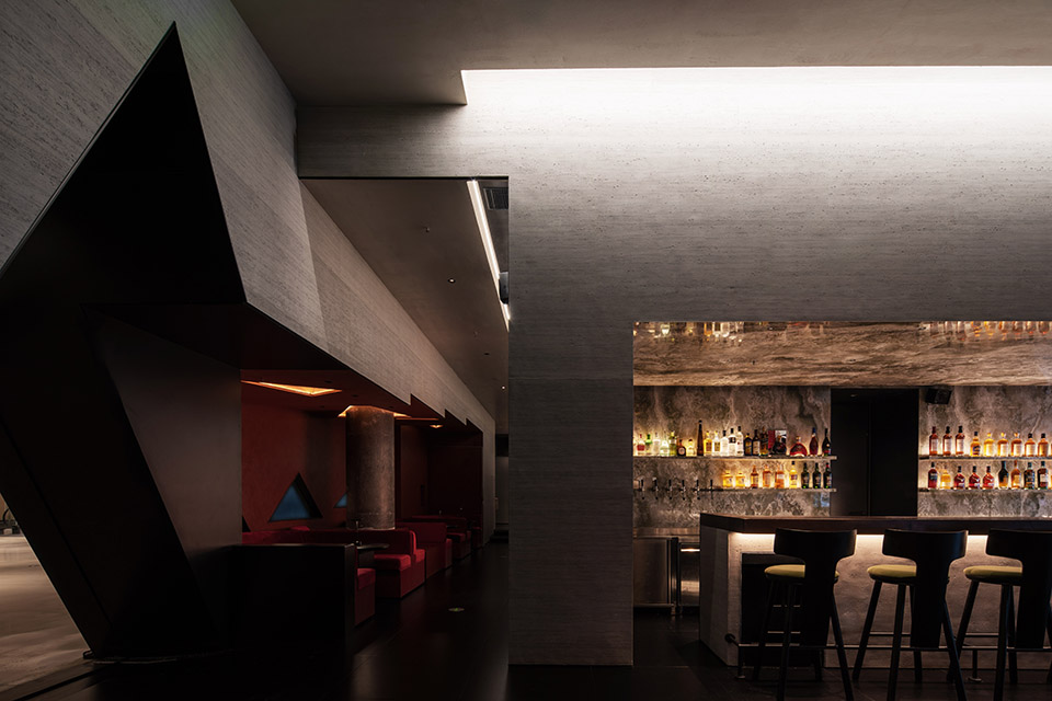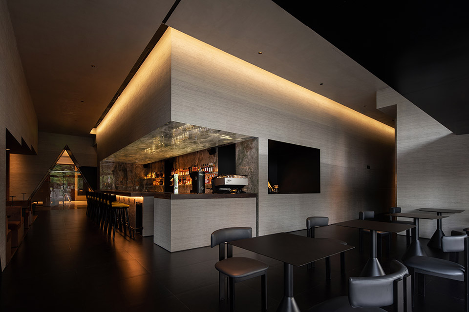 The first layer is super-scale. Five solid cuboid volumes nearly 5 meters high mimic mined caverns, placed closely to form slits that define entrances and void spaces. By day, they resemble a stone henge casting massive shadows under sunlight, contrasting sharply with typical bars and eateries; by night, light seeps through the gaps, hinting at interior activities and inviting exploration and entry. Multiple niches and inner rooms for resting and prolonged sitting are carved inside the “monoliths”, creating a strong scale contrast and delivering a sense of enclosure and comfort. Two serrated niches encircle the horizontally carved main bar to form the seating area; diverse materials and rich sectional relations shape an elegant and balanced visual experience.