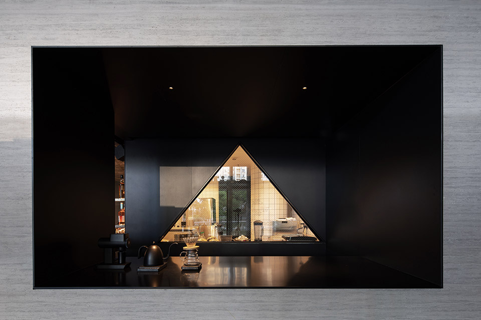 第一层次为超尺度,以五块近 5 米高的长方体实体模拟开采后的矿洞形态,相互紧邻形成狭缝,界定入口与虚空空间。日间如巨石阵般在阳光下投射巨大阴影,与常规餐饮酒吧形象形成反差;夜间缝隙透出光线,暗示内部活动,吸引探索与进入。“巨石” 内部开凿多处停留、久坐的壁龛与内室,形成强烈尺度对比,营造包裹感与舒适氛围。两组锯齿状壁龛环绕水平切割的主吧台,共同构成客座区;多元材质与丰富剖面关系,塑造典雅均衡的视觉体验。