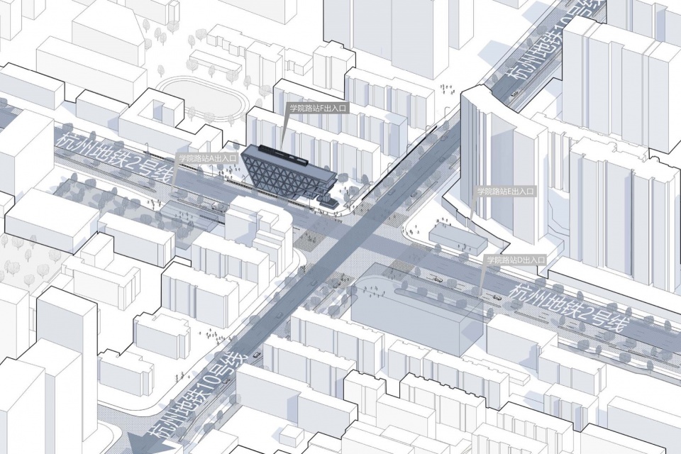 项目为学院路站F出入口上盖附属用房,位于杭州市西湖区学院路与文二路交叉口东南侧,处于杭州老城中心区较为成熟的居住板块之中。依托地铁2号线与新建10号线换乘站的区位条件,场地具备便捷的对外交通联系,也因此具有更强的城市公共属性。