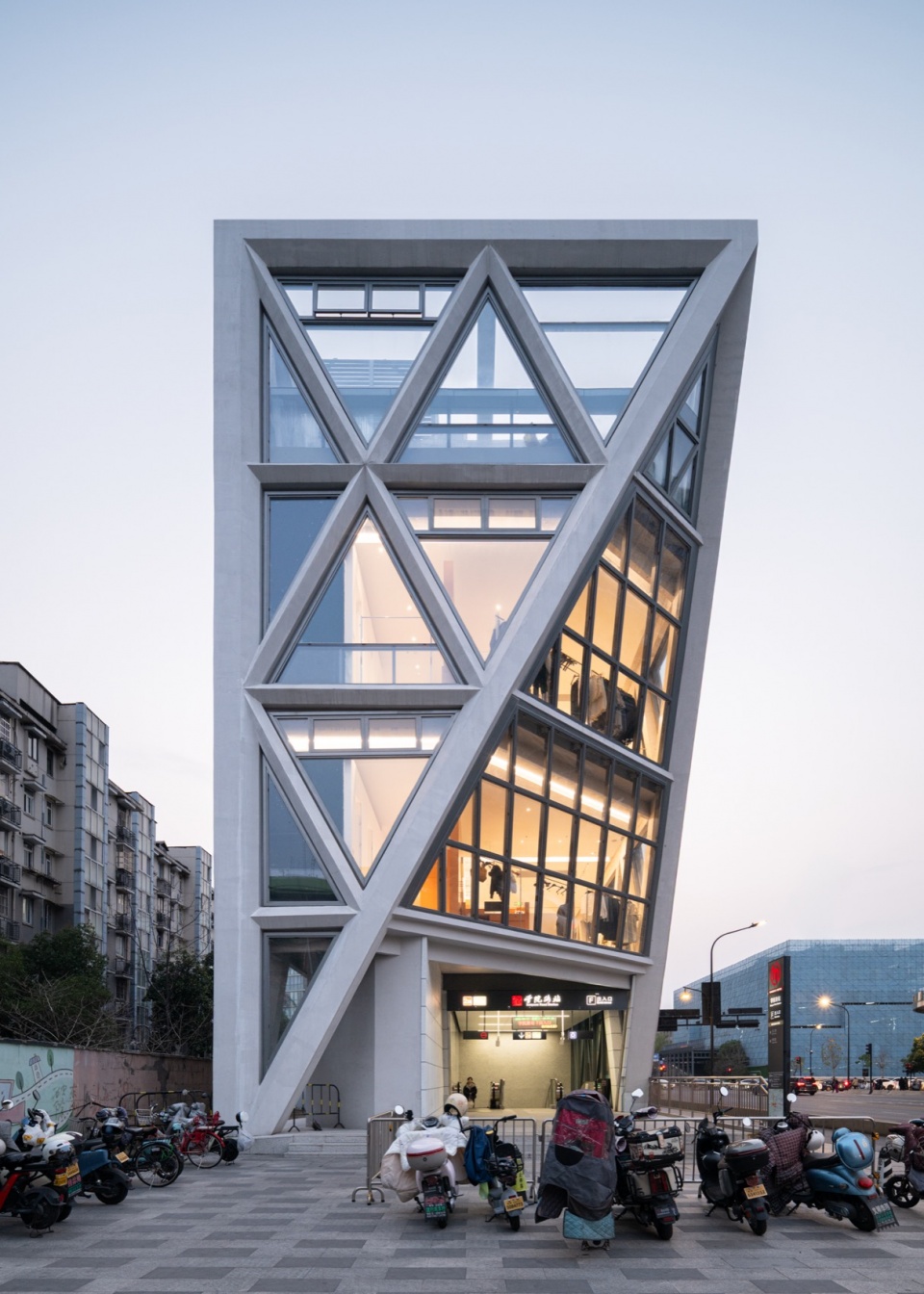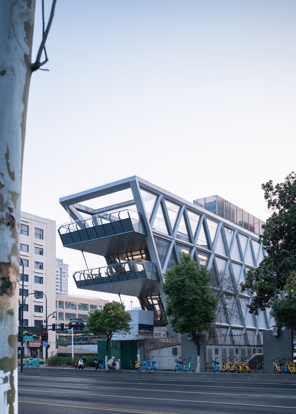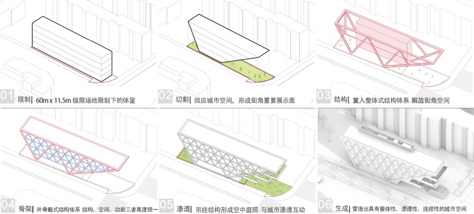 为了回应建筑形体与空间组织的整体逻辑,项目采用了外骨骼式结构体系。这一策略并非单纯的形式表达,而是同时回应了空间与城市两个层面的需求:一方面,结构直接参与建筑形象与空间秩序的生成,实现结构、功能与空间的统一;另一方面,外骨骼体系为局部悬挑提供了直接支撑,使建筑得以在有限场地内主动退让地面空间,将更多街角界面释放给城市与行人。这种一体化的处理方式,使建筑在尺度上更完整,在视觉上更清晰,也让街角空间呈现出更强的连续性、渗透性与整体感。