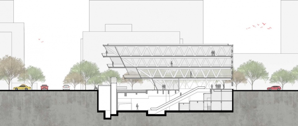 In response to the overall logic of architectural form and spatial organization, the project adopts an exoskeleton structural system. This strategy is not a mere formal expression, but responds to the needs of both space and city at the same time: on the one hand, the structure directly participates in the formation of architectural image and spatial order, realizing the unification of structure, function and space; on the other hand, the exoskeleton system provides direct support for partial cantilevers, enabling the building to voluntarily retreat the ground space in a limited site and return more street corner interfaces to the city and pedestrians. This integrated treatment makes the building more complete in scale and clearer in vision, and also makes the street corner space present stronger continuity, permeability and integrity.