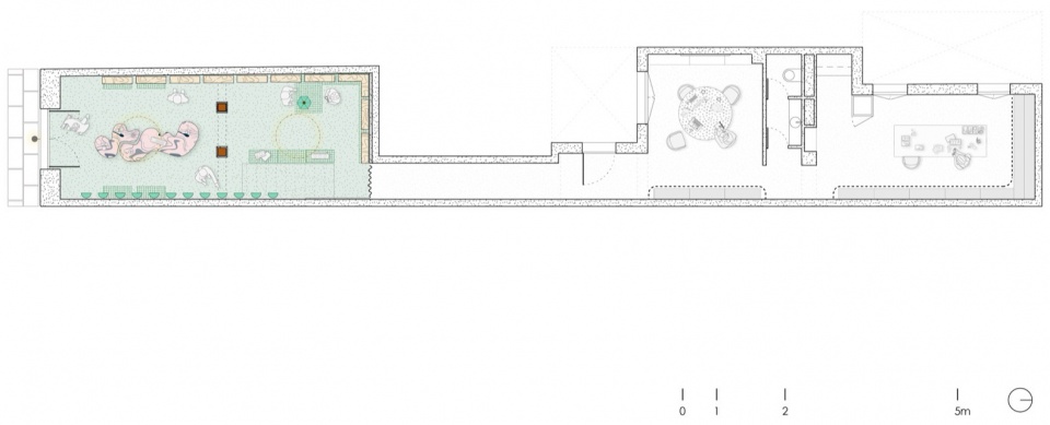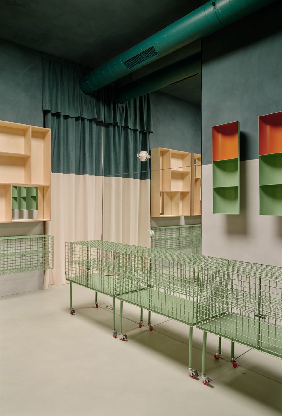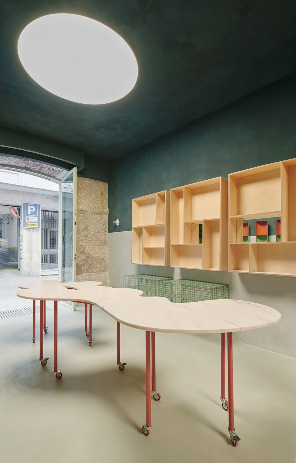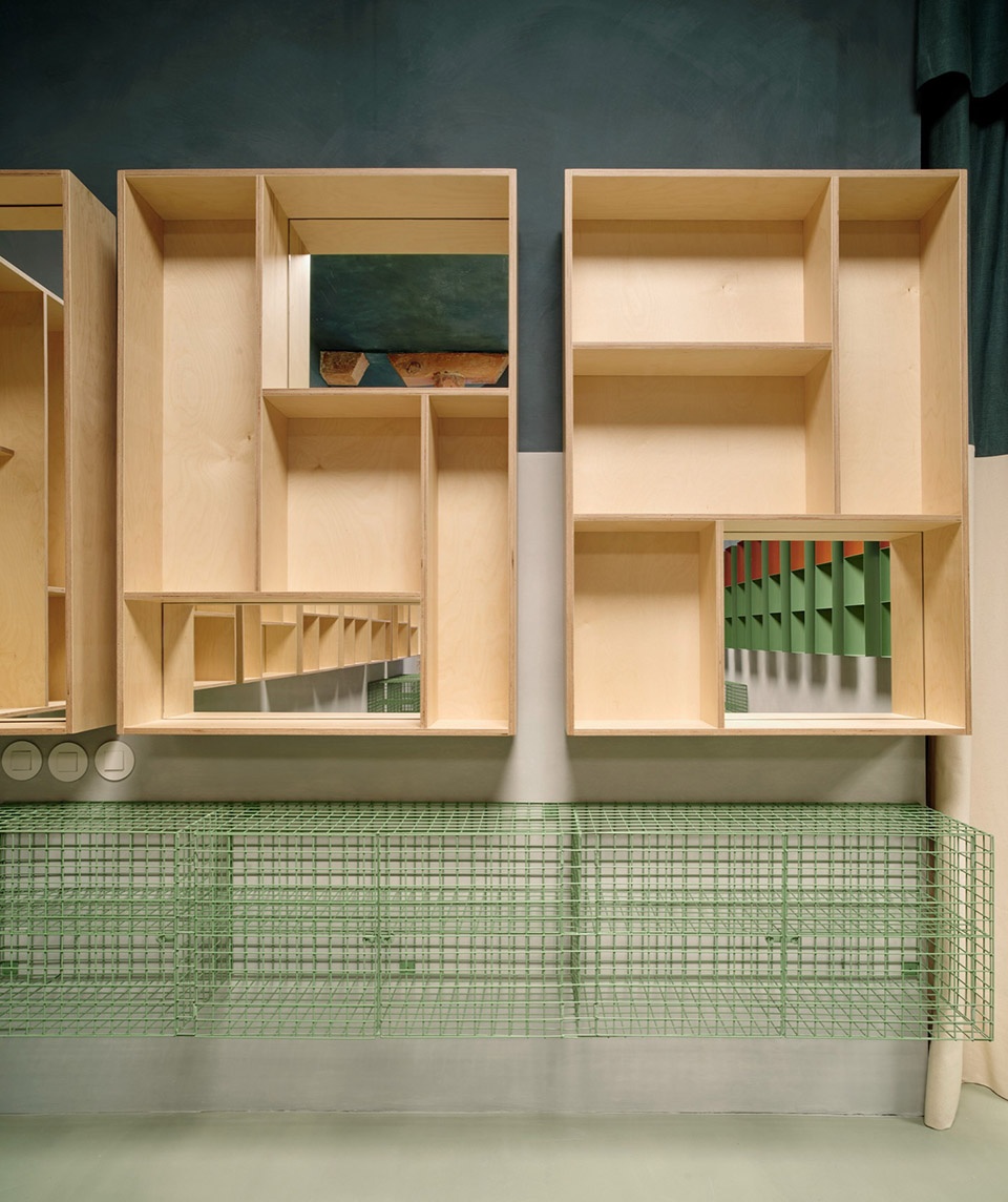 顶光、深绿色调以及木材、石灰洗涂料与金属构成的材料体系,共同营造出一种具有触感与光感的环境,引导人们停留与体验。