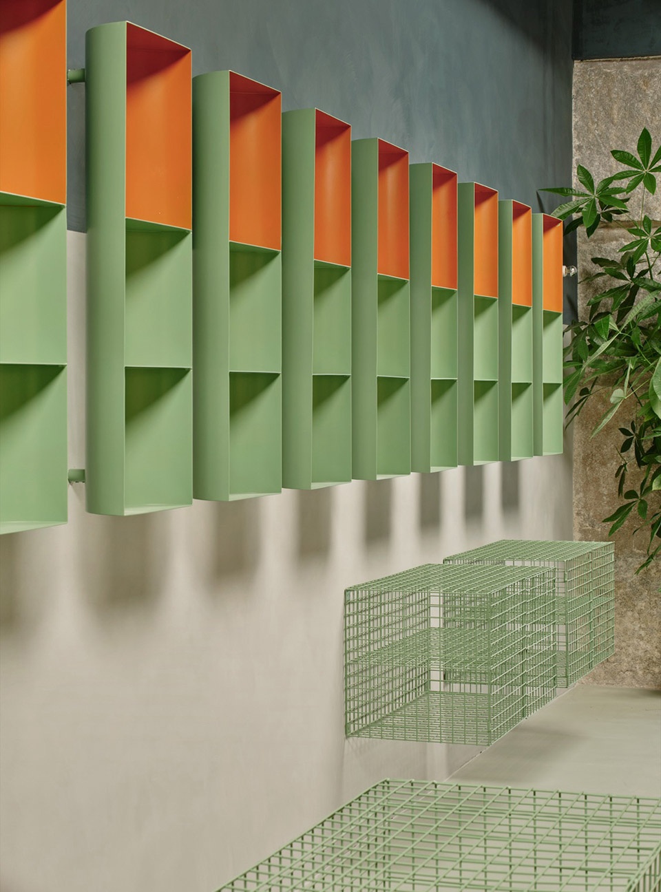 Judd metal niches, metal grid furniture and wooden shelves
