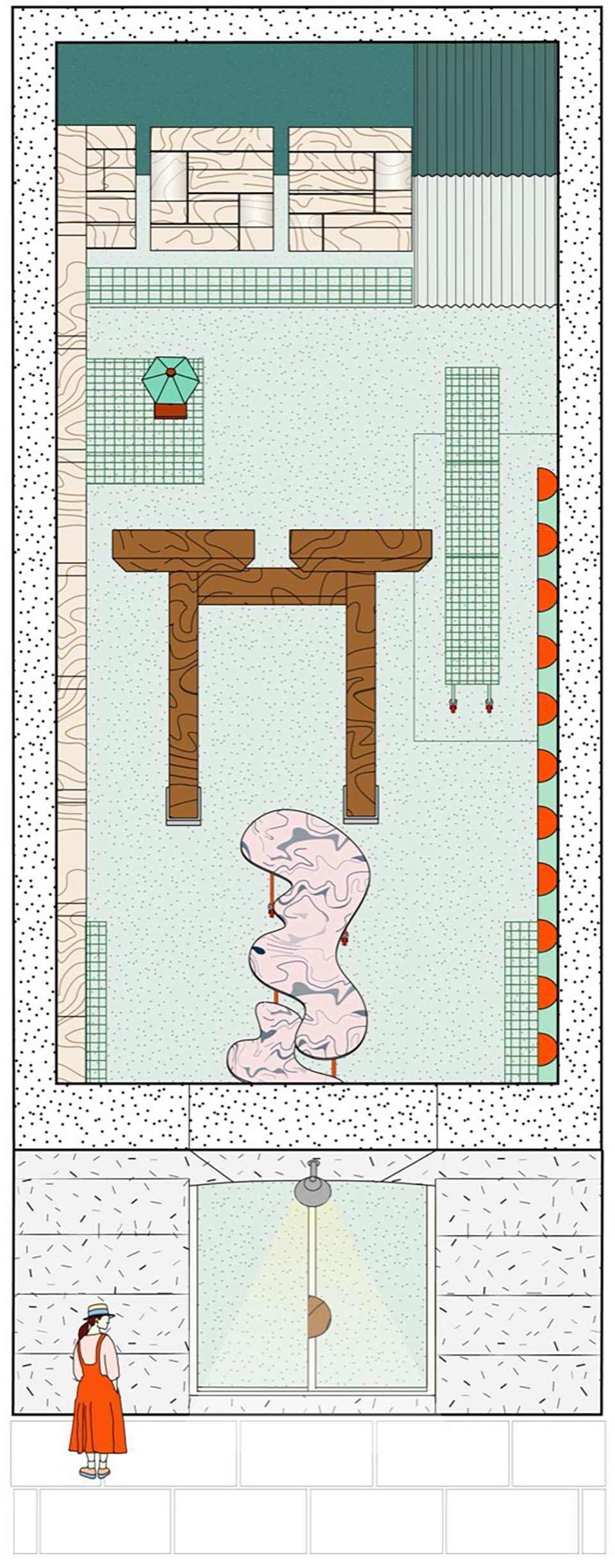 Pause and experience are encouraged by a tactile and luminous environment created by the overhead light, deep green tones, and material palette of wood, limewash paint, and metal.