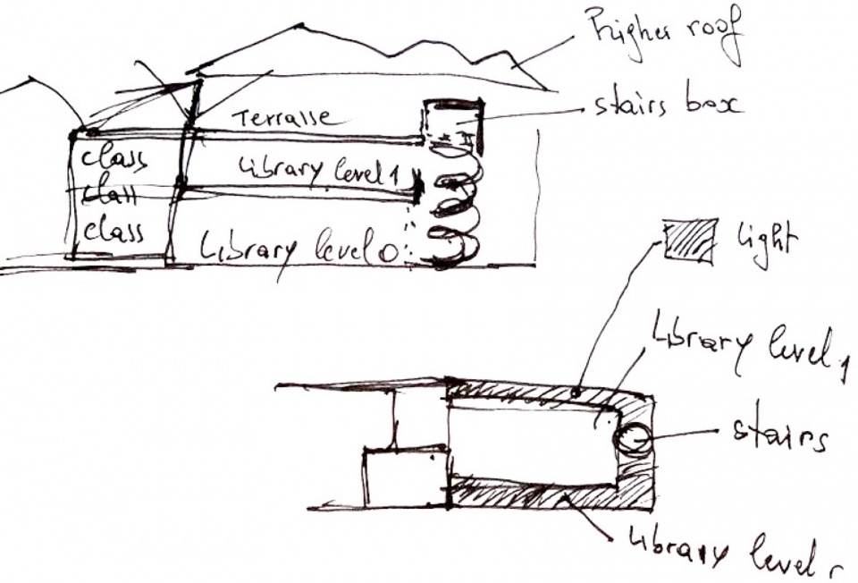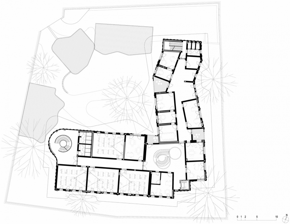 公共功能主要集中在首层,包括报告厅、咖啡厅与图书馆;行政办公室与教室设置在二层。建筑顶部覆以一层屋盖,为各层提供遮荫保护,提升热工性能并防护雨水侵袭,同时呼应下方树木与花园的自然、有机形态。贯穿各层的设计强调可持续策略,确保建筑在其物理占地之外对环境的影响降至最低。