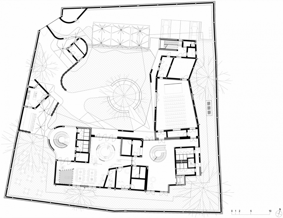 建筑坐落于达喀尔一处被郁郁葱葱花园环绕的居住区之中。Kéré Architecture的设计在尊重周边邻里环境——包括毗邻的莱奥波德·塞达尔·桑戈尔博物馆——的同时,也回应了一个承载展览、语言课程、音乐会及非正式聚会等多元活动的文化机构需求。紧凑的两层体量顺应场地上既有树木的树冠轮廓展开,其整体体量既作为屏障,减少对周边居民的噪音影响,也为访客提供隔绝街道交通的相对安静环境。