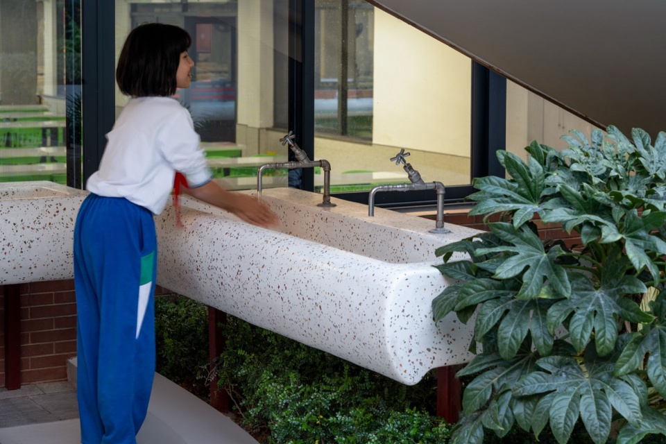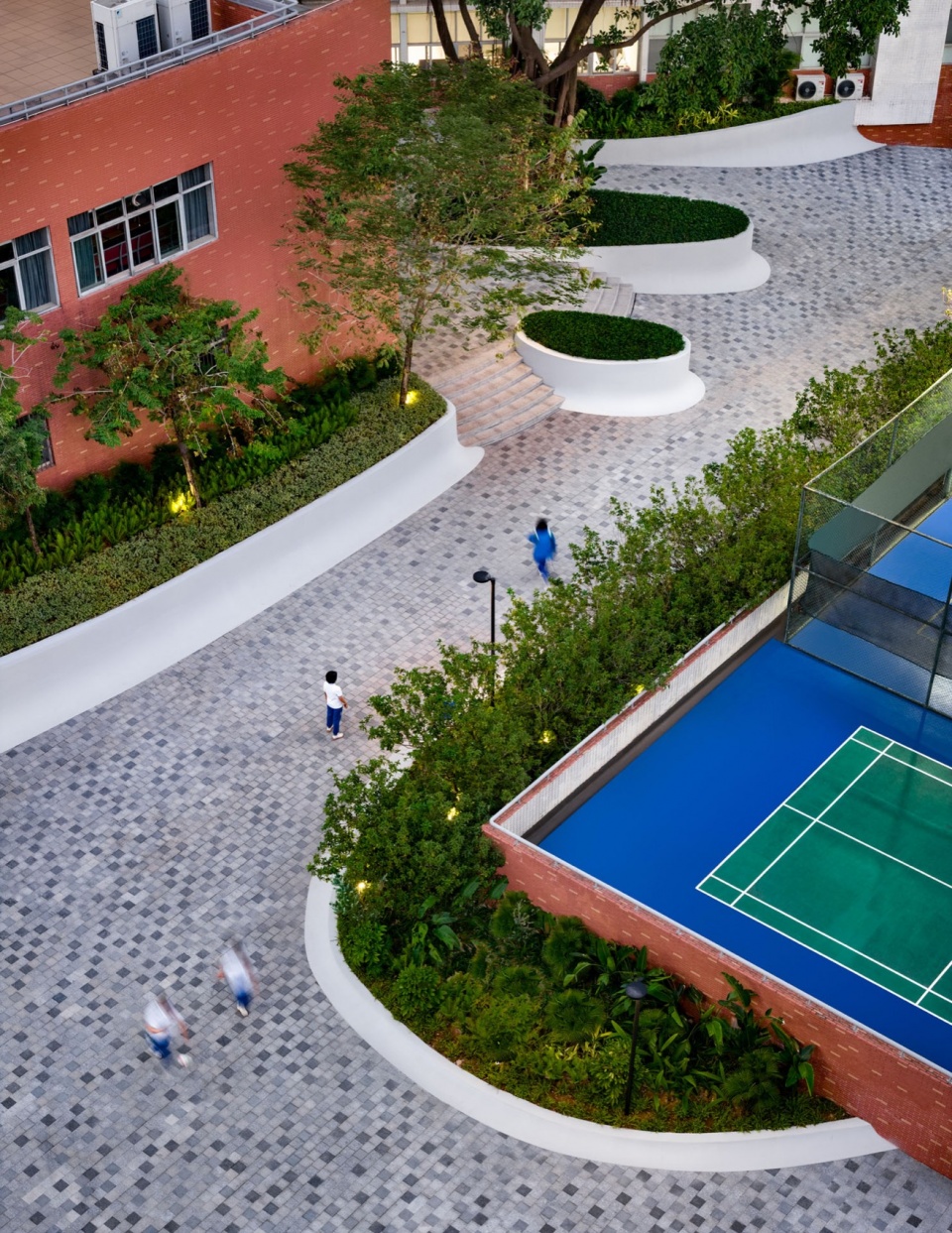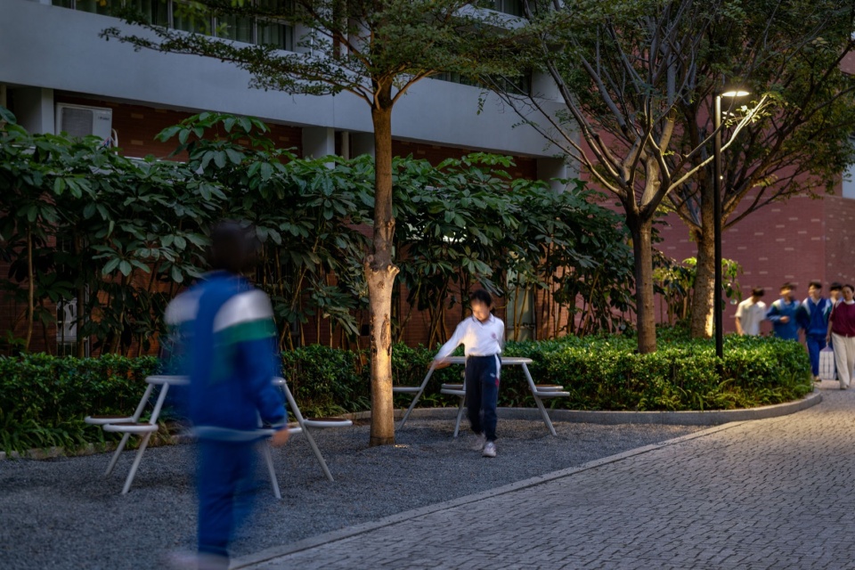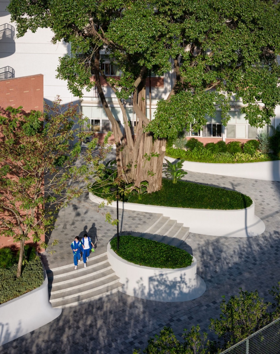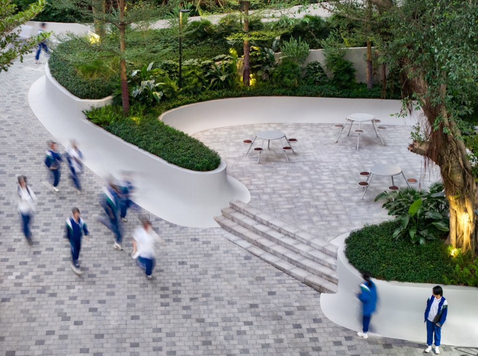 光影成为最好的装饰。植物的影子洒在干净的表面与石材铺装上,轻盈、动态,而又宁静。奔跑的少年身影掠过其间,动静相映,校园顿时生机盎然。