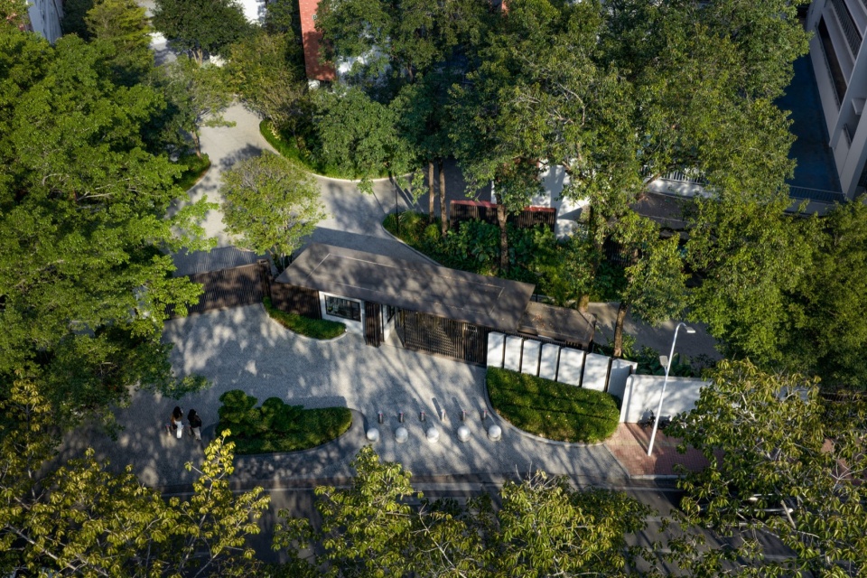 -Light intervention, heavy preservation: nearly all mature trees remain in place; original wall textures are continued so the new and old naturally converse.