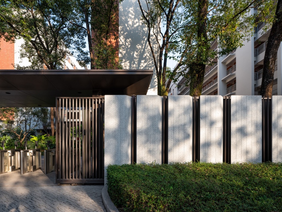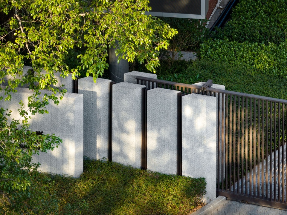 Metal slats fence and stone walls overlap to achieve a balance of transparency and ceremony.