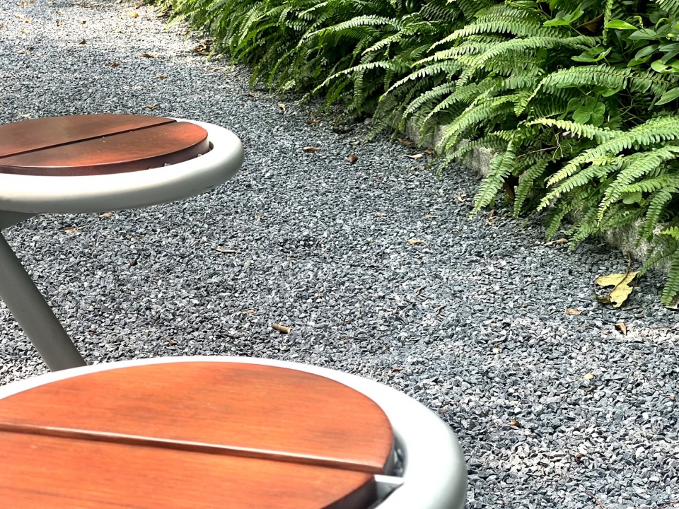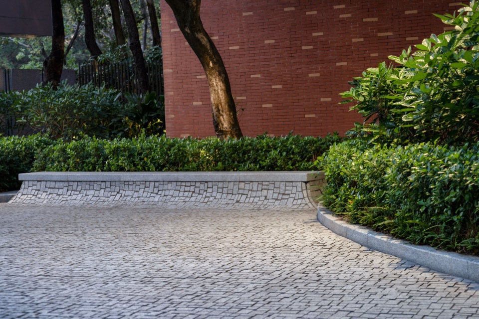 我们采用10种不同尺寸的花岗岩,以单元重复拼贴,形成如岁月包浆般的有机缝隙。弧形花池仿佛从地面自然“生长”出来,与铺装融为一体。林下用餐区则选用碎石铺地,随性而惬意。