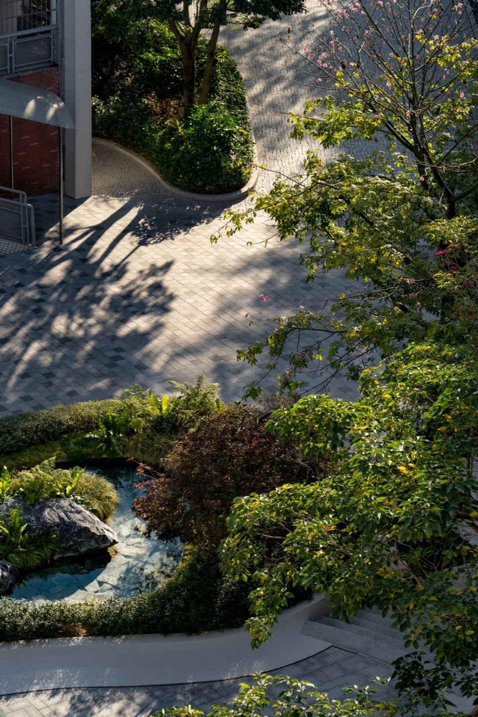 其中,一个种植池被转化为静谧的水景,与置石、水生植物及几株点睛的观赏造型枫共同构成一个微型的生态群落。它围合出教学楼入口前一处宁静的过渡空间,潺潺水声与摇曳树影,在抵达教室前先平复了心绪。这处水景不仅是视觉焦点,更是调节微气候、寓教于乐的生态节点。