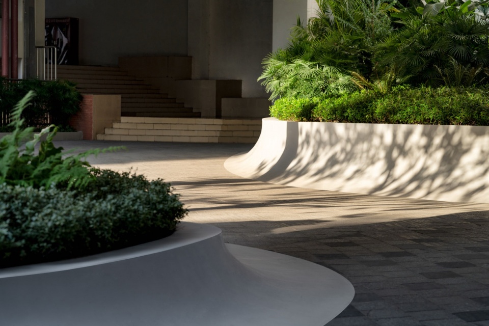 这里地形起伏更大、功能更复合。我们将一期的弧形语言纵向拉伸,转化为三维的立体种植池与台地,既消化了复杂高差,也巧妙地围合出多样的活动角落,将通行空间转变为可停留的社交场所。
