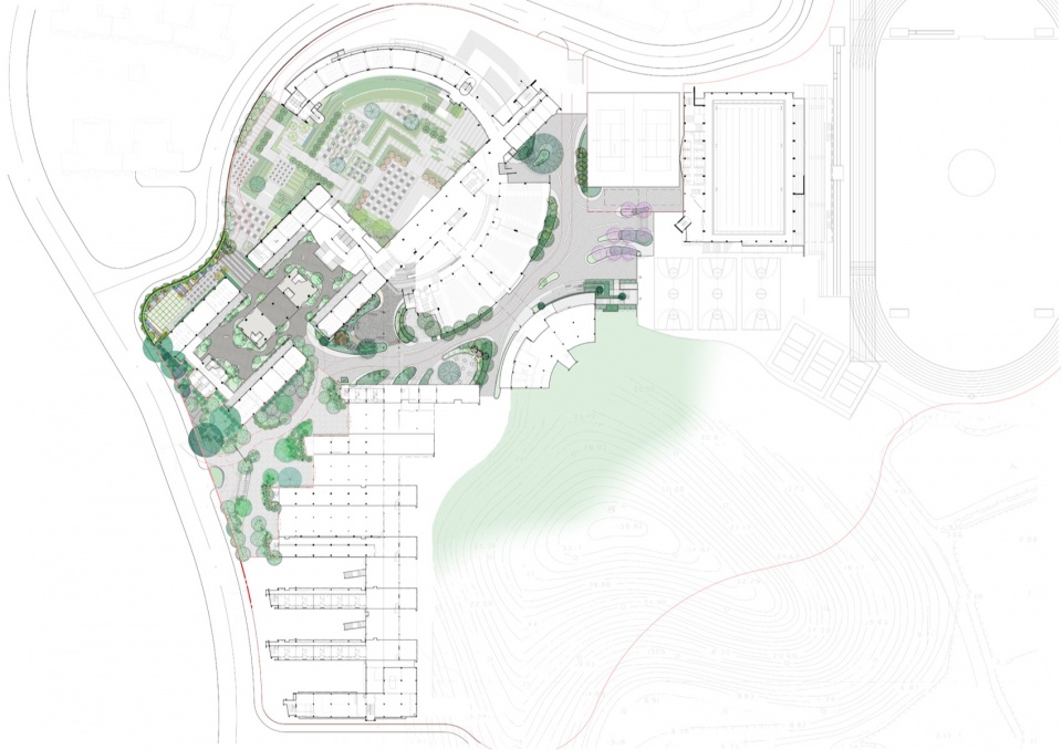 在广州市番禺区,有一所依山而建的校园——南方学院番禺附属中学。117亩的校园里,山林占了三分之一,绿意葱茏,自然天成。但历经二十五余年时光,场地逐渐显露出岁月的痕迹:路面老旧、动线交错、户外活动空间不足、景观风貌滞后…