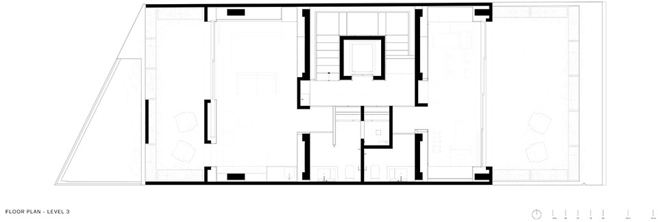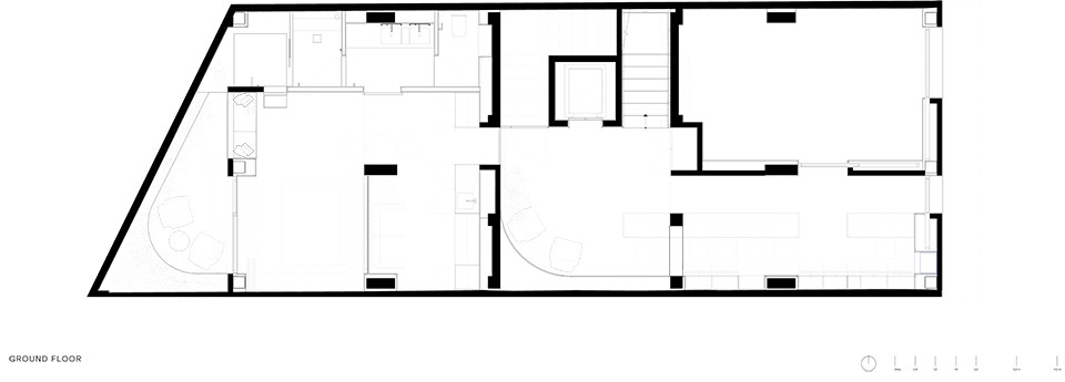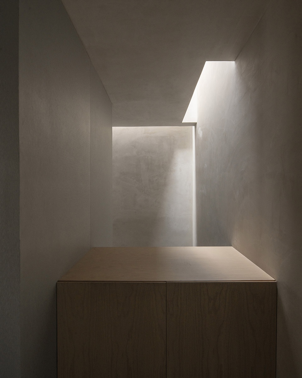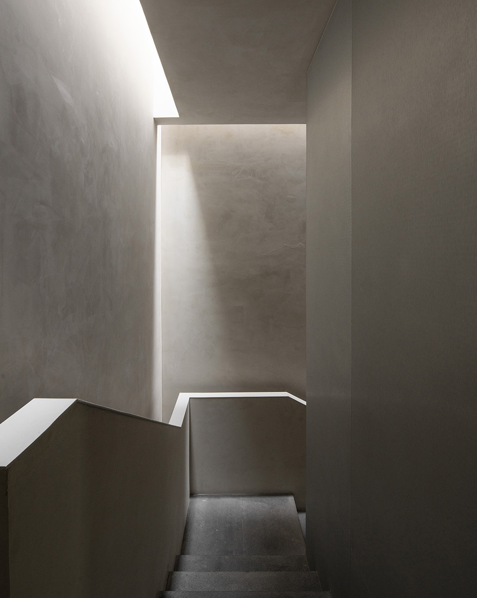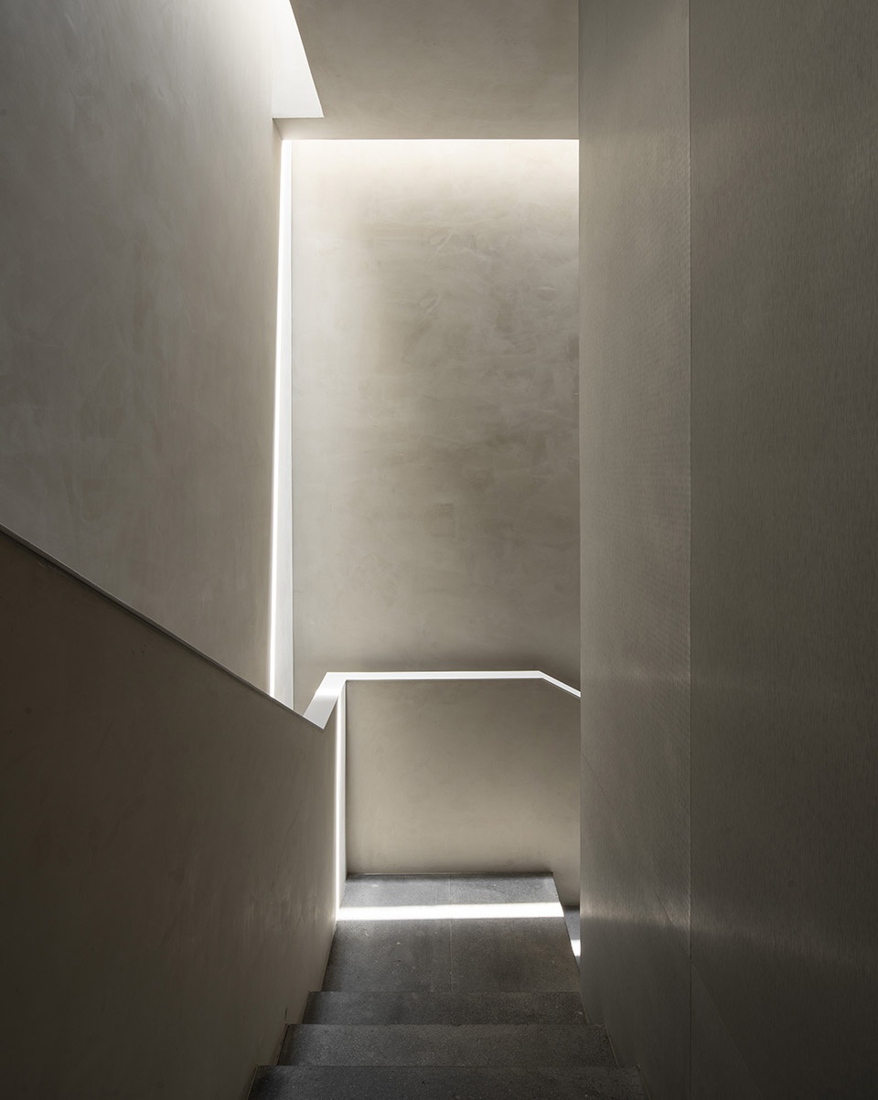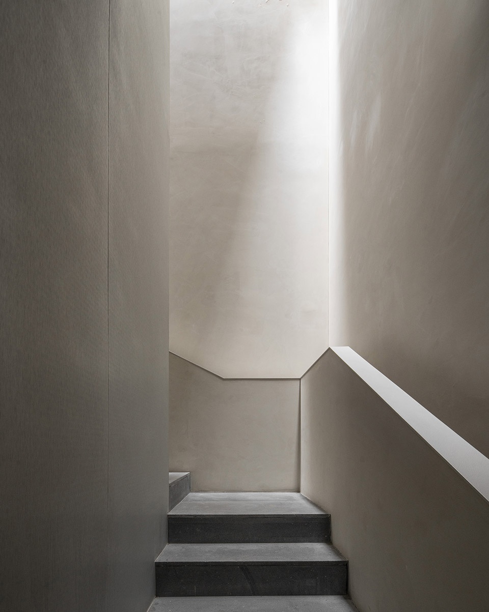 从项目伊始,主要挑战便十分明确:在受限的场地条件下最大化自然采光。解决方案来自上方——一个中央天窗结合覆以金属表皮的楼梯,形成一条垂直光井,将自然光引入建筑深处。这一建筑策略不仅解决了采光问题,也成为项目在结构与诗意层面上的核心。