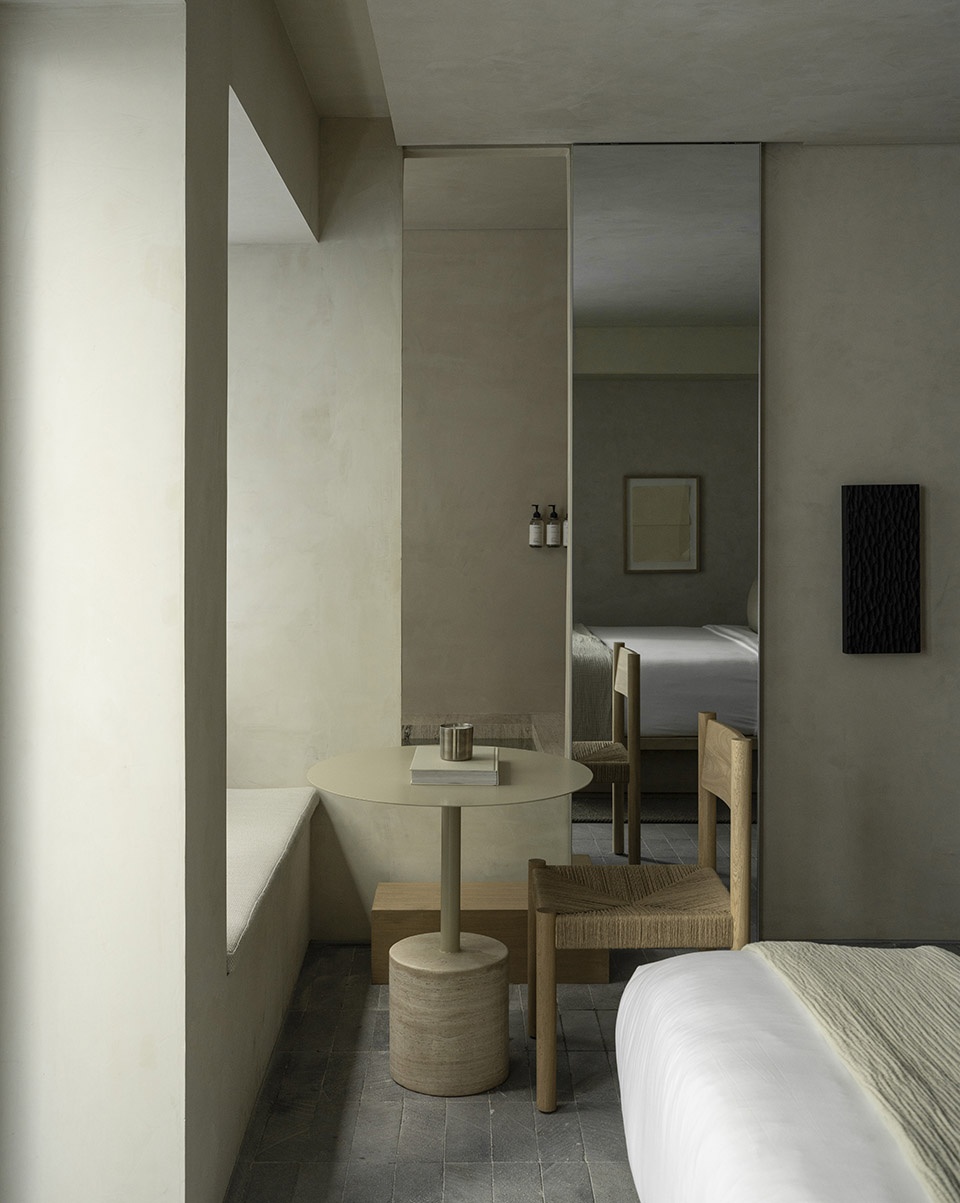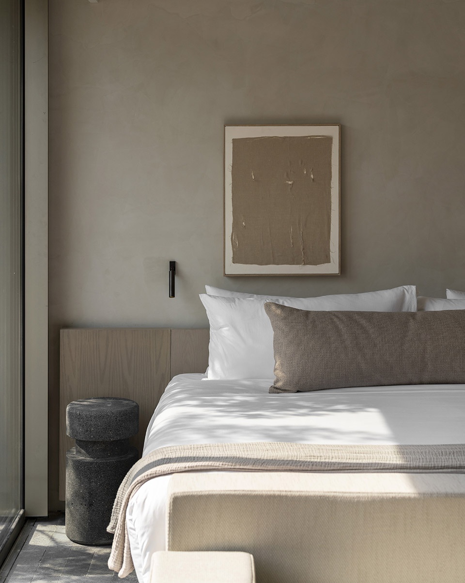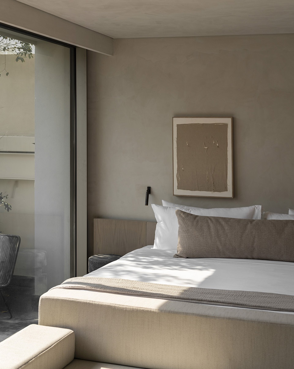 Facing the street, the main façade strikes a balance between openness and privacy. Rooms with balconies are protected by a semi-transparent metal mesh, designed to offer two key benefits: visual privacy from the outside and unobstructed views outward for the guests. Beyond its visual and spatial role, this mesh also helps regulate temperature by creating a microclimate that reduces heat gain in rooms exposed to direct sunlight.
