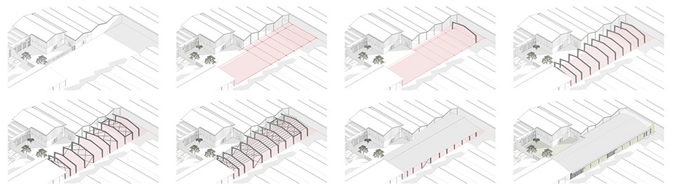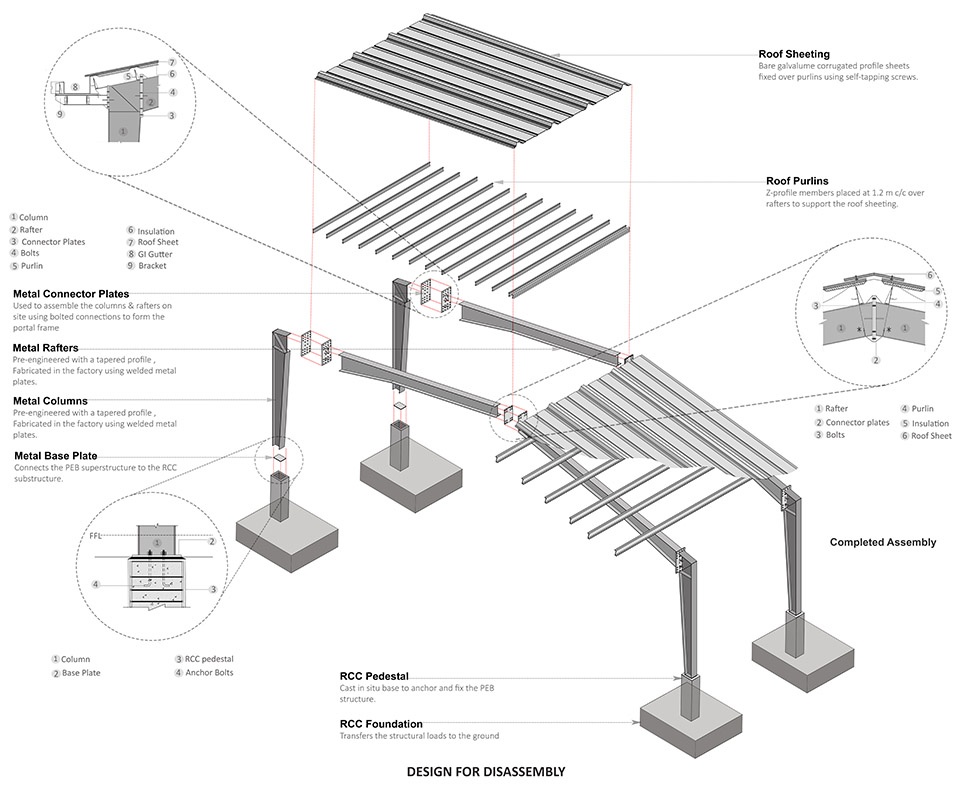 扩建部分采用预制门式刚架体系:构件在工厂完成加工,并在现场于20天内完成组装。所有结构连接均采用螺栓连接而非焊接,从而避免焊接所带来的能耗与碳排放,同时确保结构可被完整拆解。当设施需要扩展、迁移或重组时,整体框架可以被拆除,并在其他场地重新使用。尽管墙体无法整体迁移,但其采用加气混凝土建造,可在后续的建筑或道路工程中被再利用。该策略显著减少了潜在的拆除废弃物以及新材料生产所带来的隐含碳排放。这一方法从根本上重新思考了建筑与时间的关系:建筑不再走向“过时”,而是被设计为持续演化的系统,将材料的循环性同时视为环境责任与设计美学。