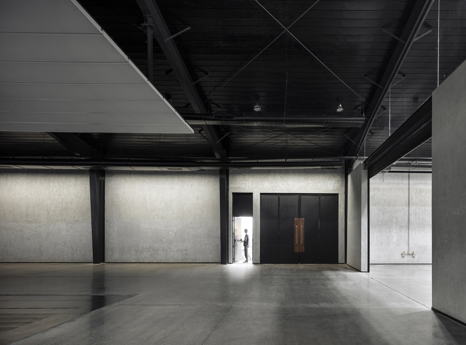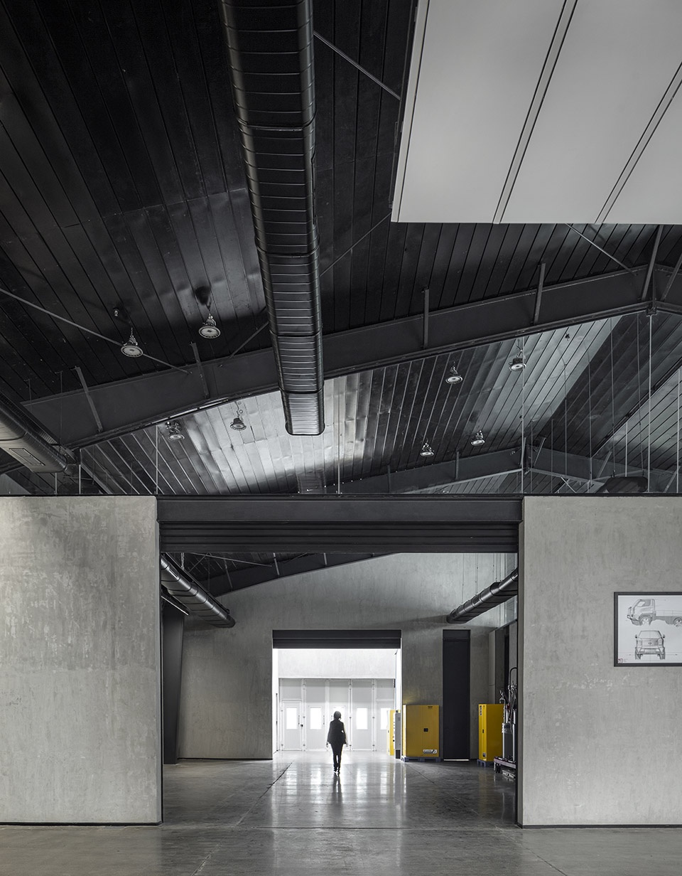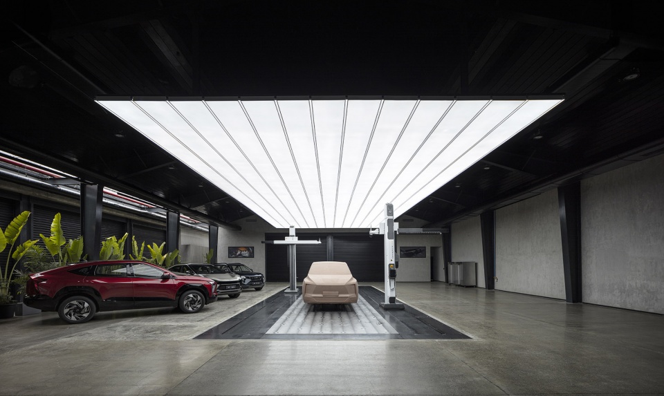一个锋利、清晰的黑色钢结构体系构成项目的视觉与结构骨架。结构被有意外露,每一个构件的比例与连接节点均经过精细设计,使其不仅承载功能,同时成为汽车设计过程的背景舞台。
