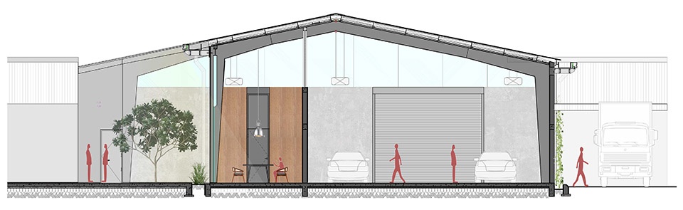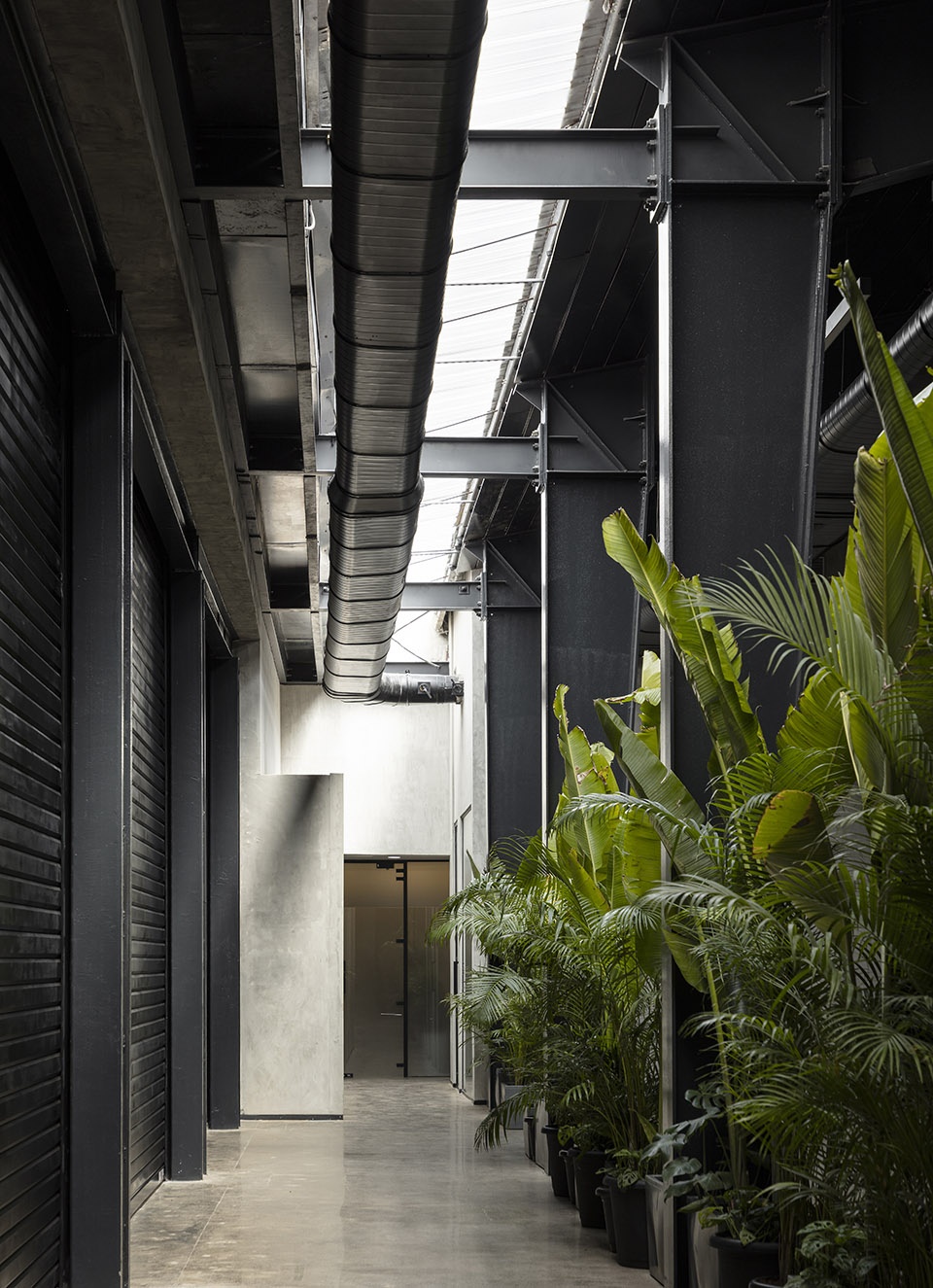 The second gesture is more dramatic. A connecting street is carved into the 2.5-metre gap between structures, topped with a continuous skylight and lined with potted plants. This luminous threshold transforms what could have been a utilitarian corridor into a refreshing spatial experience. In an otherwise completely sealed-off shell, the changing quality of light in this space marks the passage of time through the day, reconnecting users with natural rhythms. The southern wall of the original studio (which forms one edge of the street) is demolished and replaced with rolling shutters, allowing the two buildings to function as one expansive workspace when needed. Together, the courtyard and skylit street create spatial continuity that makes the seam between old and new disappear.