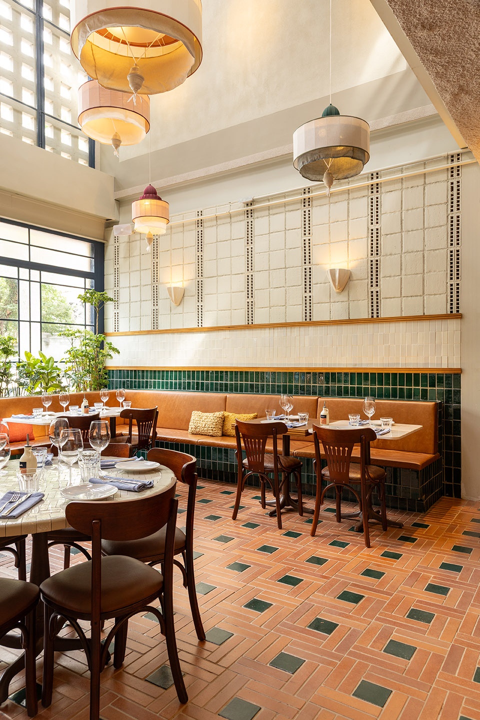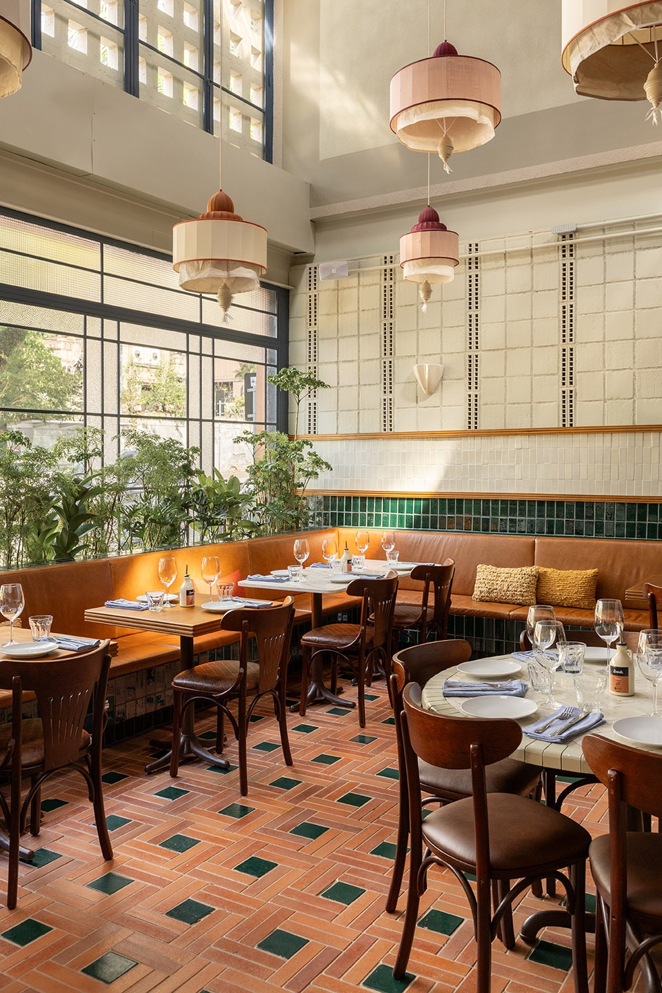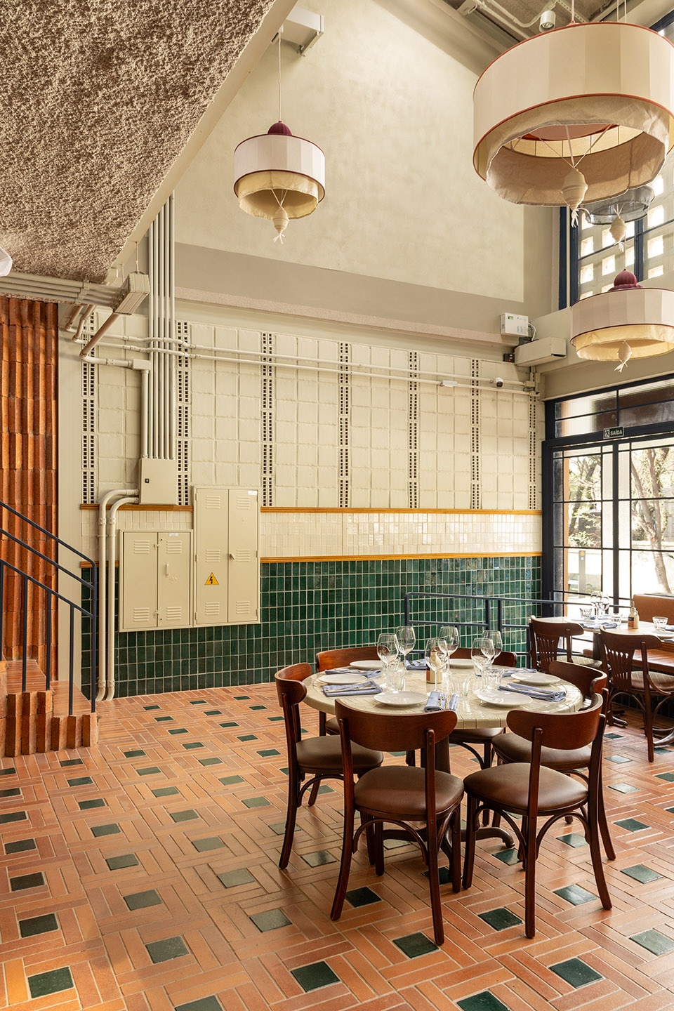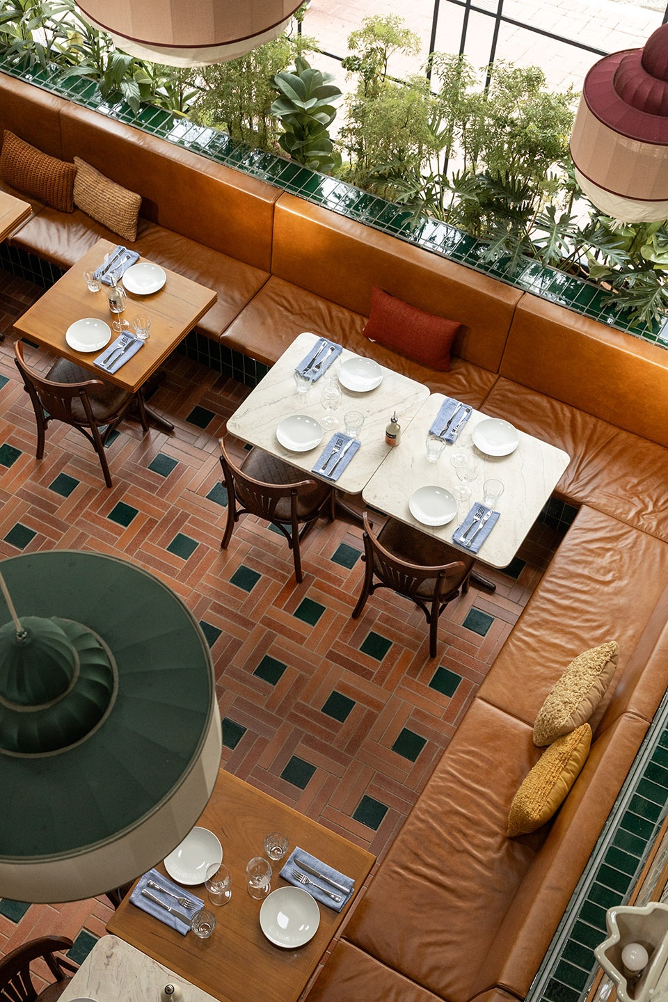 家具系统包括车木椅、白色Paraná大理石桌面与仿耐候钢涂装铁基座,以及不同尺寸的木桌以适应多样化就餐需求。较大的圆桌设置在白色瓷砖基座之上,强化手工质感。入口附近设有环绕式卡座,基座为绿色瓷砖砌体,上覆焦糖色皮革坐垫,并通过立面花池增强私密性。后区亦延续该设计,保持整体一致。