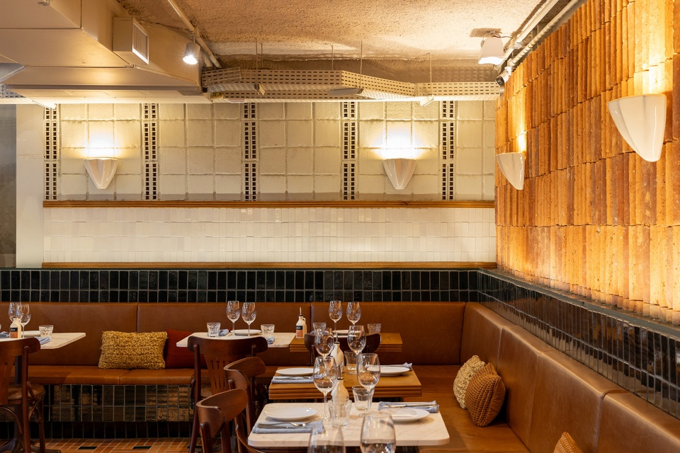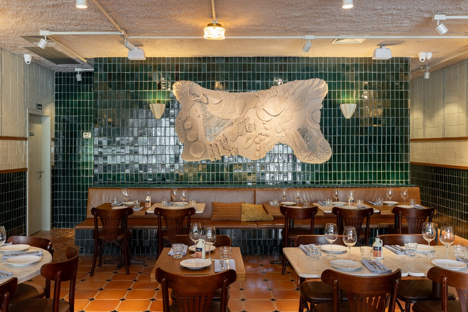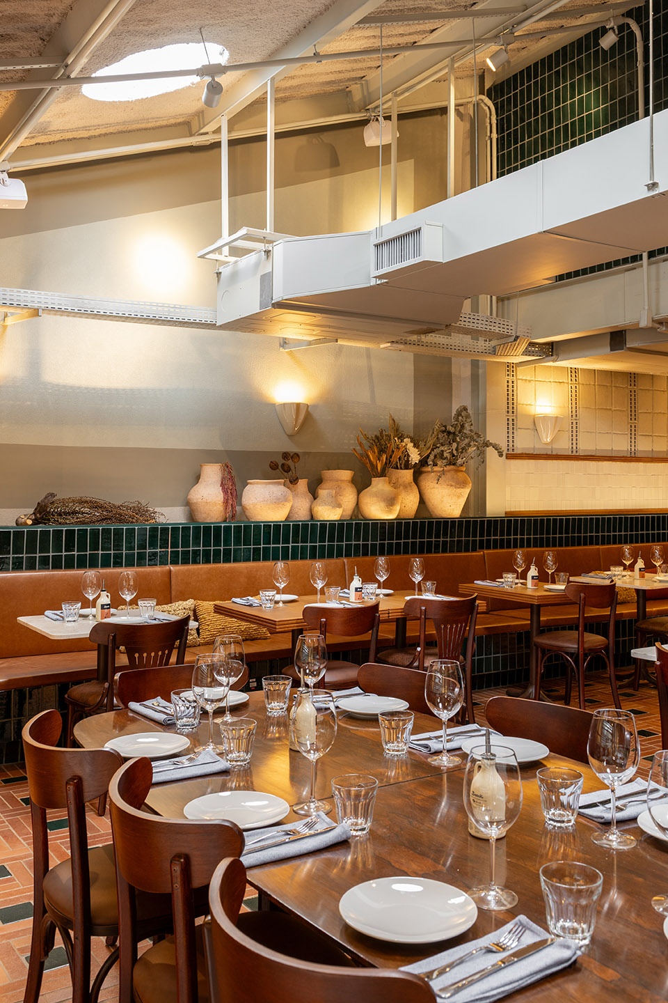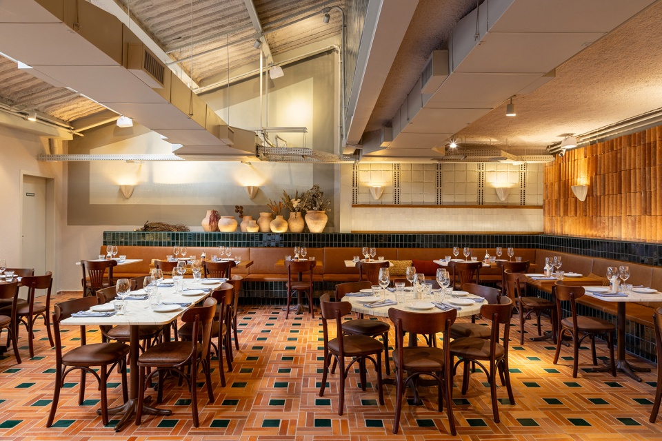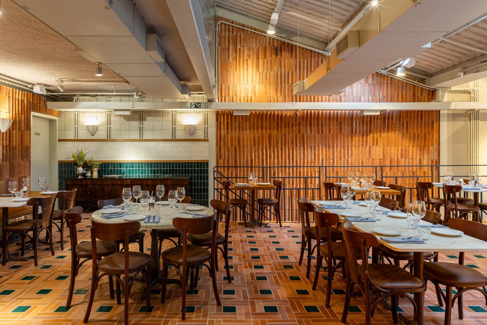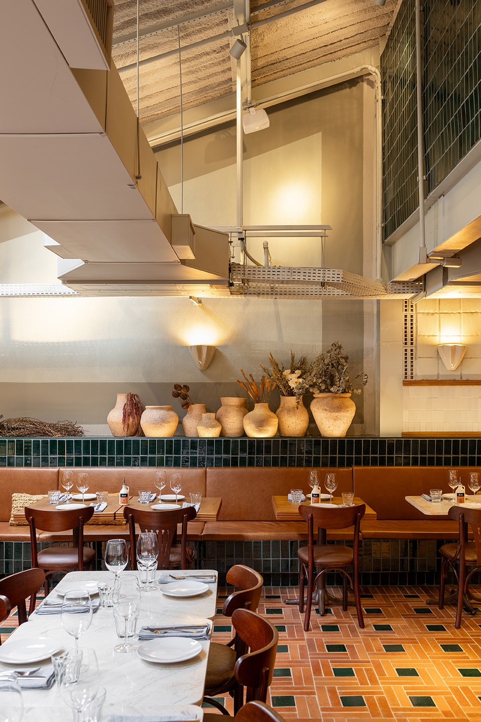 家具系统包括车木椅、白色Paraná大理石桌面与仿耐候钢涂装铁基座,以及不同尺寸的木桌以适应多样化就餐需求。较大的圆桌设置在白色瓷砖基座之上,强化手工质感。入口附近设有环绕式卡座,基座为绿色瓷砖砌体,上覆焦糖色皮革坐垫,并通过立面花池增强私密性。后区亦延续该设计,保持整体一致。