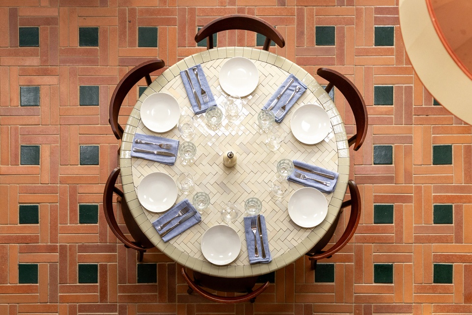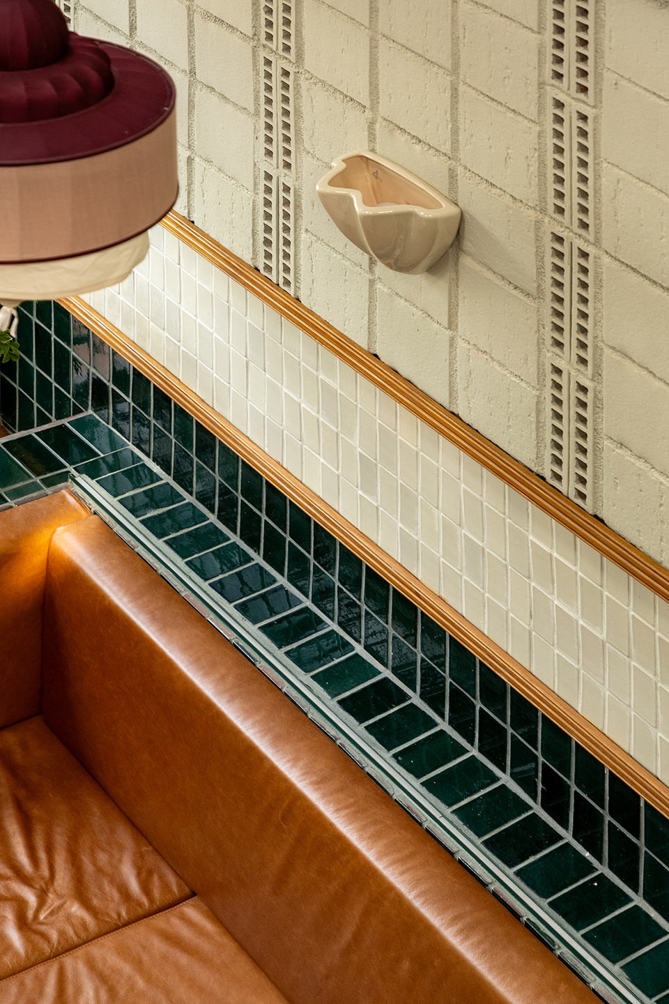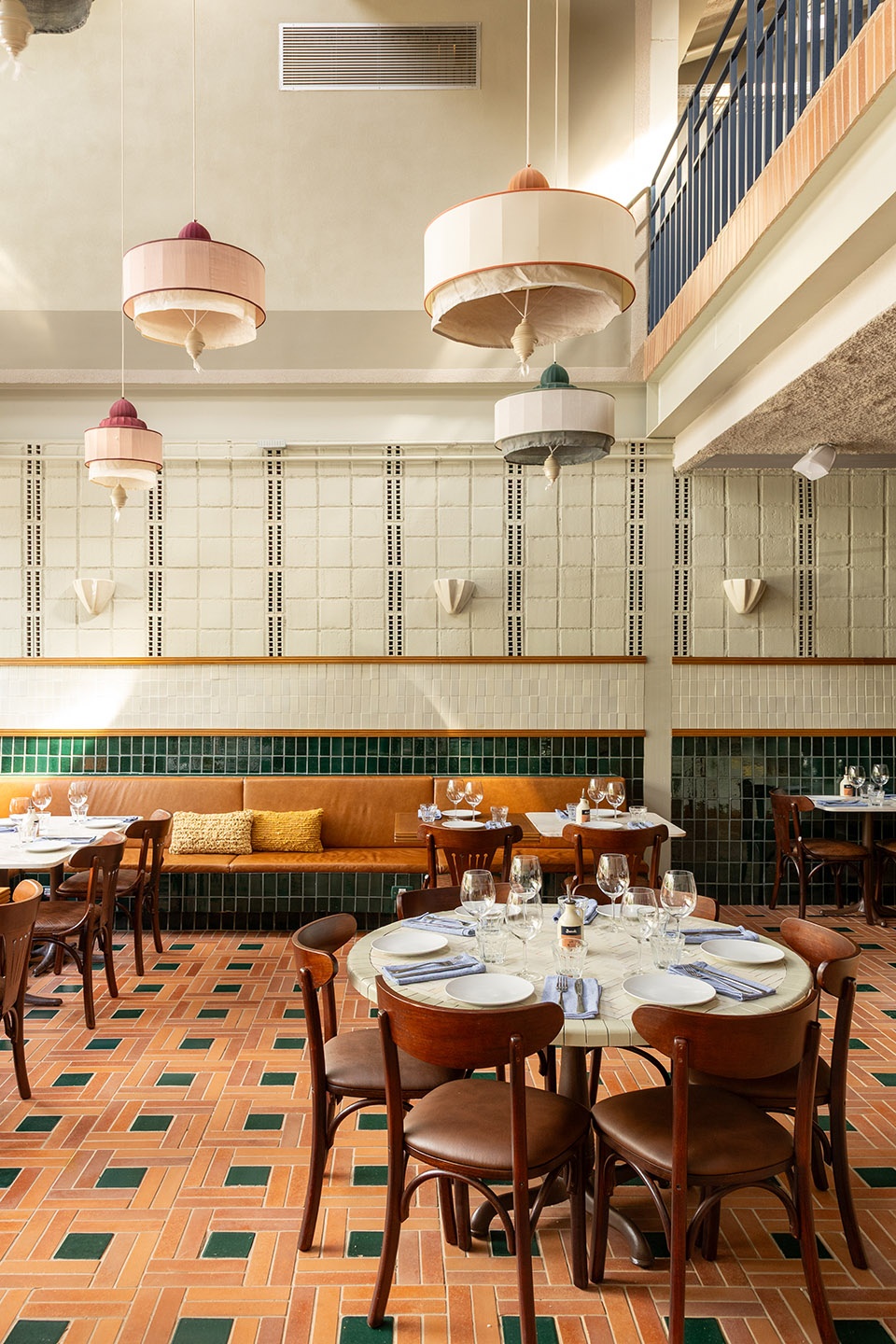 从入口开始,陶瓷地面延伸至墙面,通过几何拼贴呼应传统瓷砖工艺。设计并未采用具象图案,而是通过纯色瓷砖形成图形语言,以当代方式重释地中海庭院的铺装逻辑。主厅中,八块长方形陶土砖围绕小尺寸绿色砖拼接,形成贯穿空间的连续图案;后区则采用更传统的方砖铺设方式,保持色彩一致。整体设计在一个统一的建筑动作中融合了传统与创新。