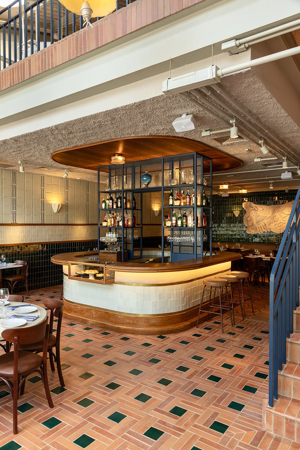 The bar, the central element of the space, functions as the heart of the restaurant, organizing and defining the main hall. With rounded corners, it softens edges and directs circulation. The masonry base is clad in ceramic tiles with a gold brass trim, while the countertop and woodwork feature rounded edges, complemented by indirect lighting. A small integrated display showcases fresh fruits for cocktail preparation. Above, a blue iron display cabinet, designed as a portico, wraps around the bar, exhibiting the beverage collection and establishing dialogue with the metallic façade elements. The ceiling above follows the bar’s projection, reinforcing the focal point.