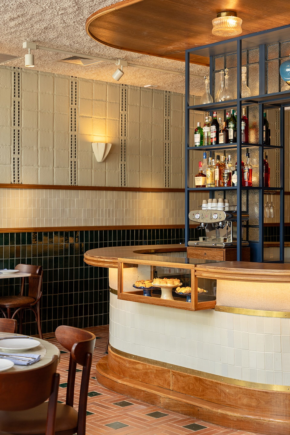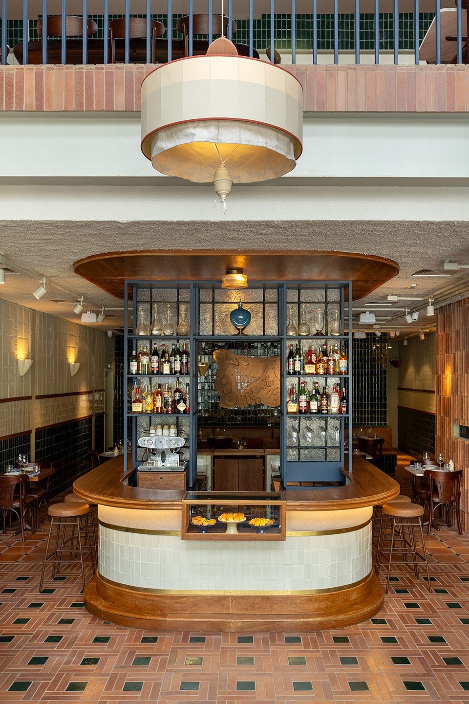 吧台作为空间的核心元素,承担组织与界定主厅的功能。其圆角设计柔化了空间边界并引导流线。砌体基座覆以陶瓷砖,并以金色黄铜收边,台面与木作同样采用圆角处理,并辅以间接照明。吧台内嵌展示区陈列新鲜水果,用于鸡尾酒制作。其上方,一组蓝色铁制展示柜以门廊形式环绕吧台,陈列酒品,同时与立面的金属元素形成呼应。上方顶面随吧台轮廓展开,进一步强化视觉焦点。