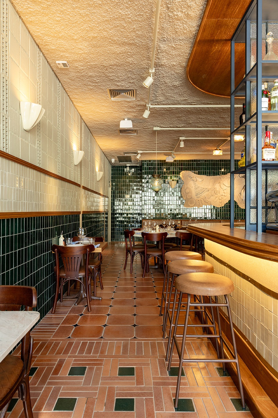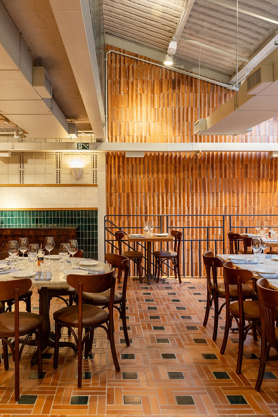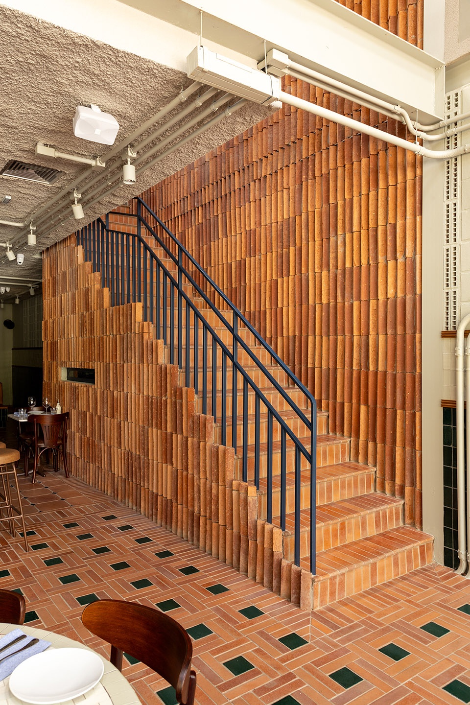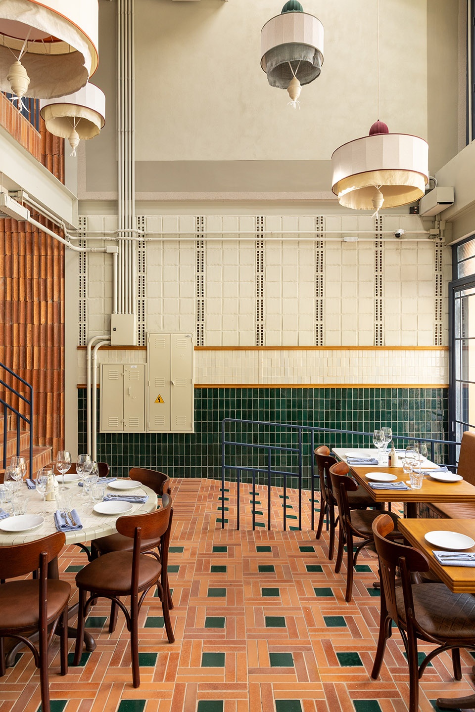 Access to the mezzanine is via a staircase with terracotta ceramic treads, while the lateral faces feature tiles rotated 45 degrees and cut into triangular sections, creating a three-dimensional effect enhanced by the light. The blue iron railing maintains consistency with other interior elements. On the mezzanine, materials and concepts from the lower floor are repeated, offering additional seating and partial views of the exterior through the façade panels. Despite the separation provided by the double-height ceiling, visual connection with the main hall remains constant. In the infrastructure, conduits, piping, and electrical elements are deliberately left exposed, integrating with the architectural reading. Bathrooms follow the same design rigor, with blue and green tiles, subtle tonal variations creating graphic panels, wooden chair rails, vintage mirrors, and concrete sinks.