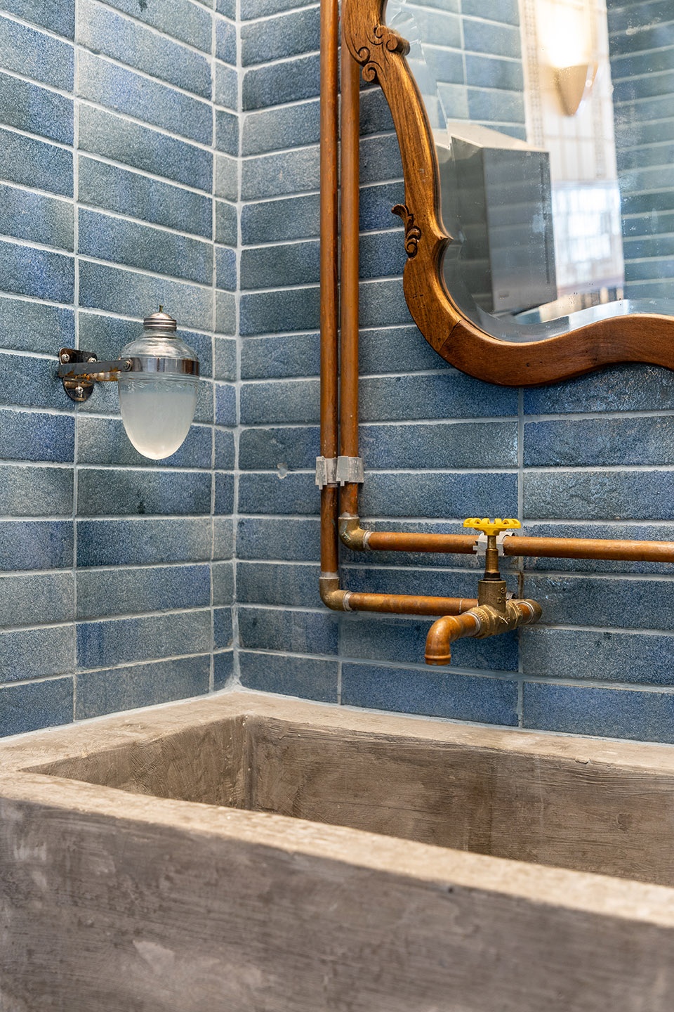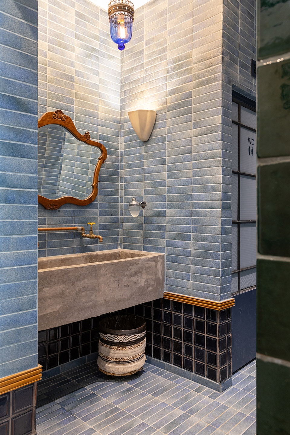 通往夹层的楼梯采用陶土色瓷砖踏步,侧面瓷砖以45度旋转并切割为三角形,形成三维肌理,在光线下更为突出。蓝色铁栏杆延续了室内其他构件的语言。夹层空间在材料与概念上延续首层设计,提供额外座位,并通过立面筛板获得局部外部视野。尽管双层通高形成空间分隔,但与主厅的视觉联系始终保持。在基础设施层面,管线、电气等系统有意外露,融入整体建筑表达。卫生间延续同样的设计逻辑,采用蓝绿瓷砖,通过细微色差形成图案面板,配以木质腰线、复古镜面与混凝土洗手台。