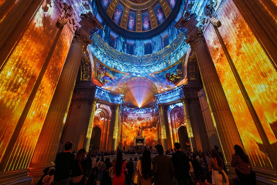 在 2023 年的第二次推出中,该框架被应用于法国最具代表性的纪念性建筑之一——被列入联合国教科文组织名录的荣军院金色穹顶(面积达 3500 平方米)及其六座礼拜堂。该项目与军队博物馆策展人及文化事务部门密切合作,通过沉浸式叙事再现建筑建造历史、法国历史地位以及其持续的精神影响。在这样一个宏大的空间中(声音回响可达 10 秒),视觉与声学的精确调校尤为关键,体现了 Moment Factory 在严苛条件下执行复杂项目的能力。