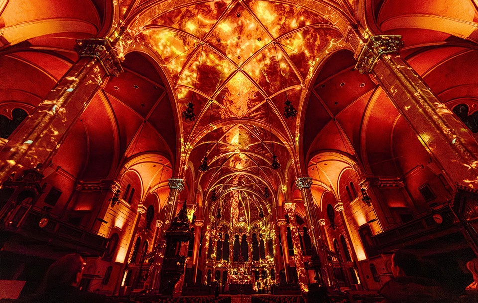 Flame-like visuals projected onto ceiling and façades