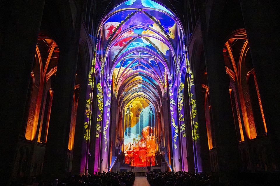 In 2025, two new AURA experiences joined the series, reflecting the format’s growing popularity and increased agility. At Grace Cathedral, site-specific storytelling reflecting the city’s ethos of openness and environmental consciousness unfolds within the vertical expanse of its Neo-Gothic concrete architecture, placing the natural world in dialogue with the space’s spiritual identity. The other 2025 debut, AURA Église Saint-Roch in Quebec City, weaves symbolism inspired by the surrounding landscape, while paying tribute to the neighborhood’s evolving cultural fabric. These new editions also marks the introduction of two series firsts: a voice-over and a companion web application offering real-time translation and supplementary historical context that extends the experience beyond the visit.