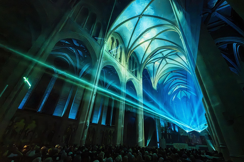 2025 年,AURA 系列迎来两项新作,体现出该形式日益增长的影响力与灵活性。在旧金山恩典大教堂中,叙事结合城市开放与环保理念,在新哥特式混凝土结构的垂直空间中展开,使自然与精神空间形成对话。另一项 2025 年作品——魁北克圣罗克教堂 AURA,则以周边景观为灵感构建象征体系,同时回应社区不断变化的文化结构。这些新版本还首次引入旁白系统,以及配套网页应用,提供实时翻译与额外历史信息,使体验延伸至观展之外。